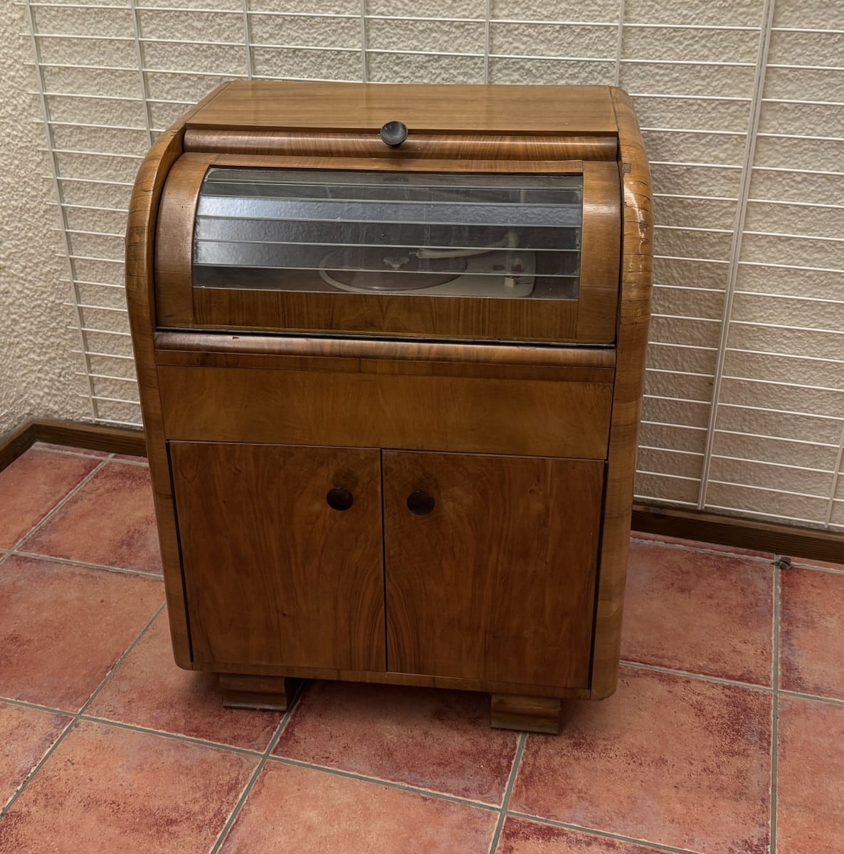 • Musiktruhe, Musikschrank, Mid-Century Schrank mit eingebautem Plattenspieler, Deutschland, 1950er B 64cm T 50cm H 81cm !!! Abholungsort Auktionshalle HELGUS !!!