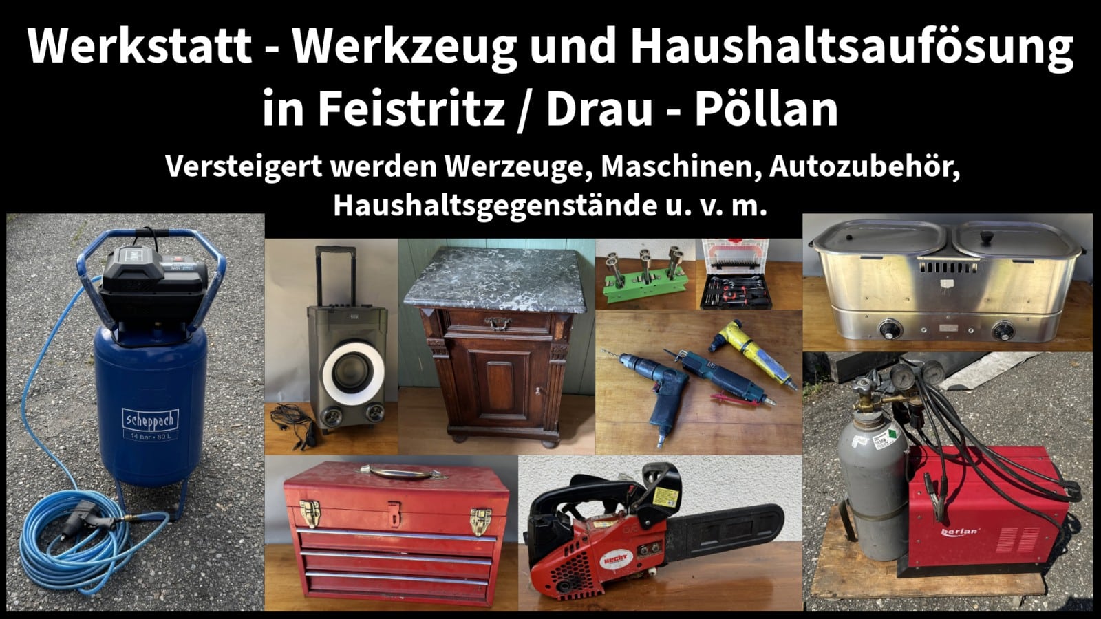 Versteigert werden sehr viele Werkzeuge, Maschinen, Autozubehör, Haushaltsgegenstände, Gartengeräte, eine Schneefräse, ein Rasentraktor uvm.