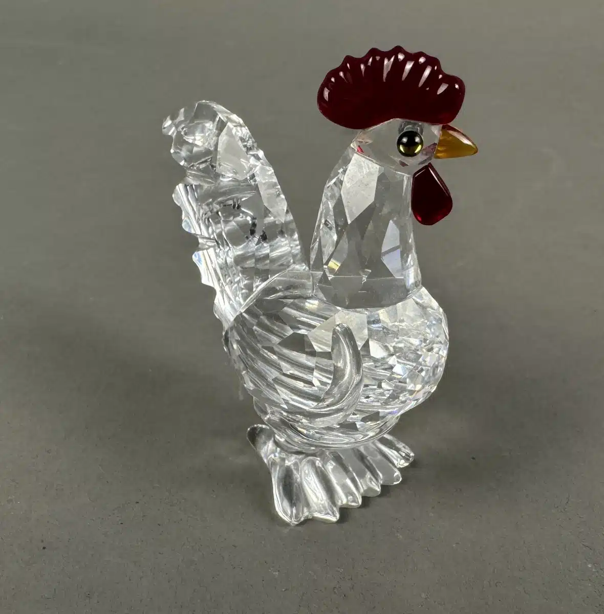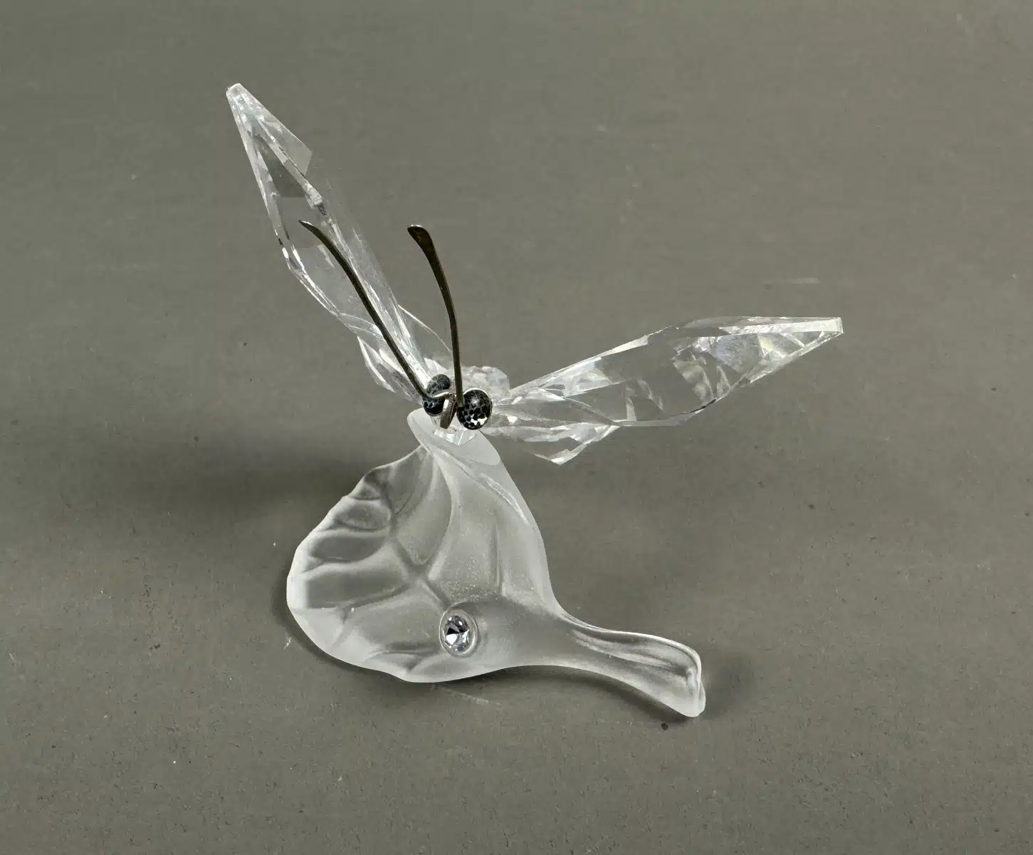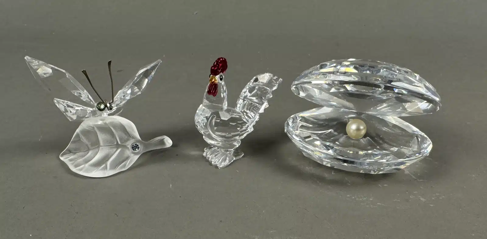 3 Stück Swarovski Kristallfiguren, Schmetterling auf einem Blatt, Hahn, Muschel mit Perle