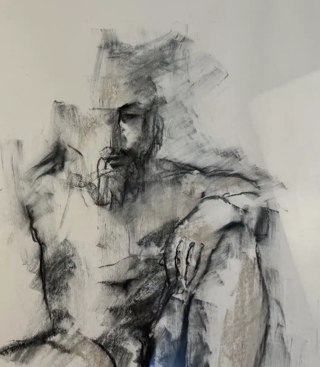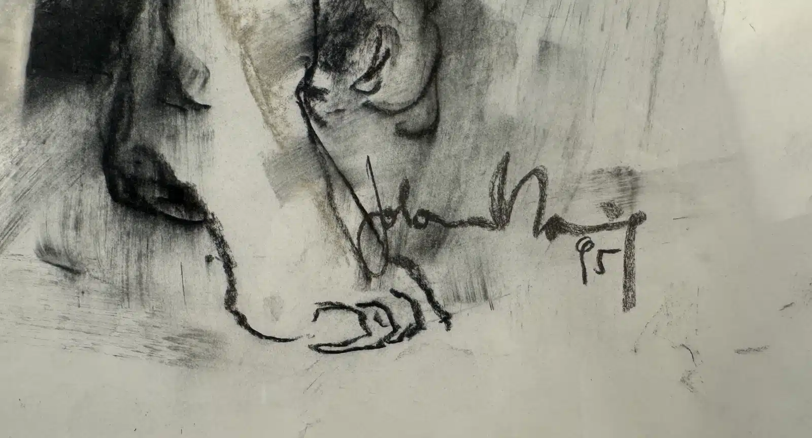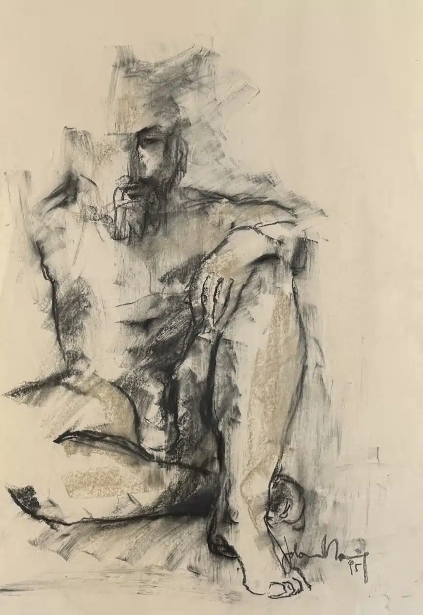 Aktzeichnung, Kohle auf Papier, sitzender Mann, unleserlich signiert, 72×52 cm