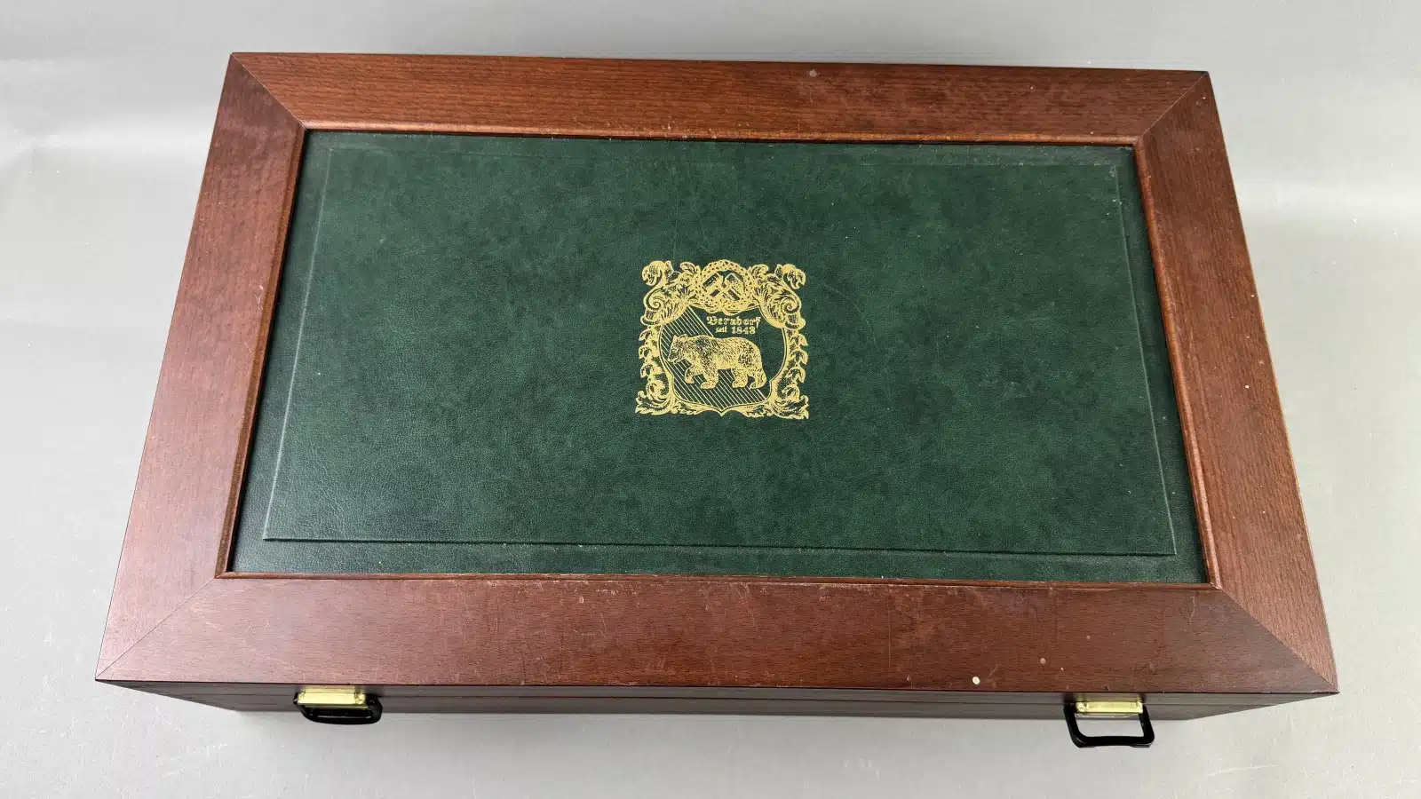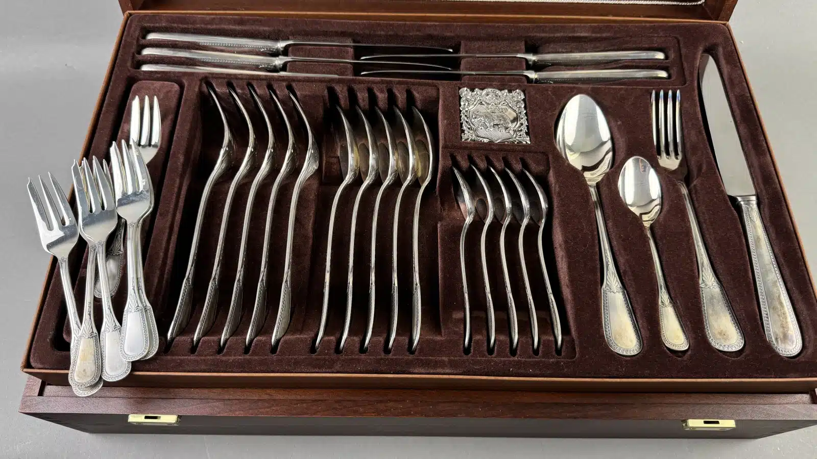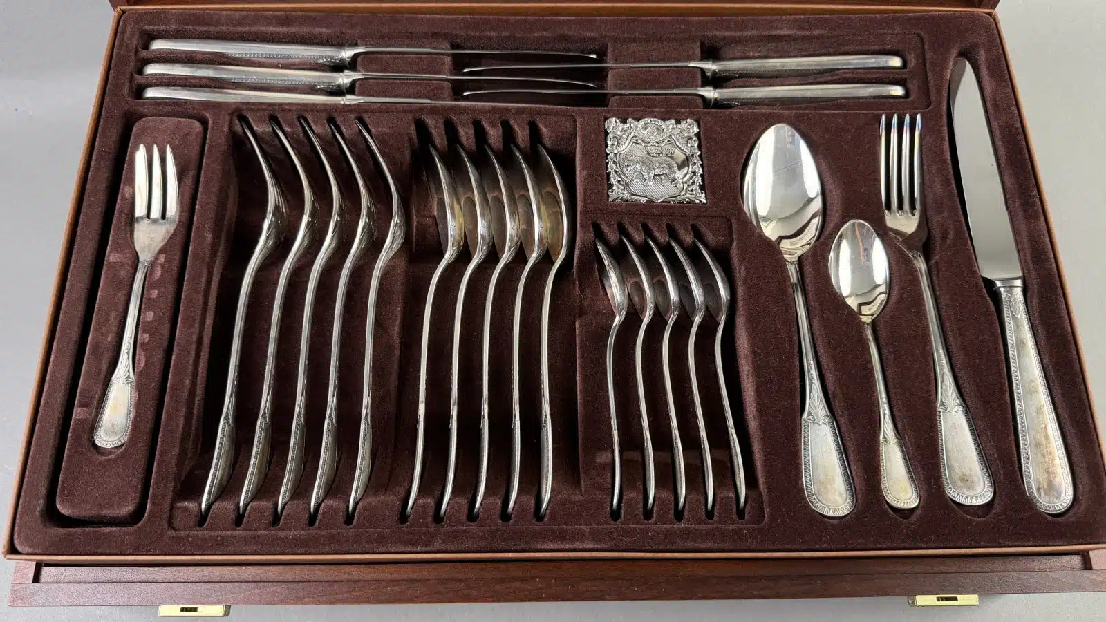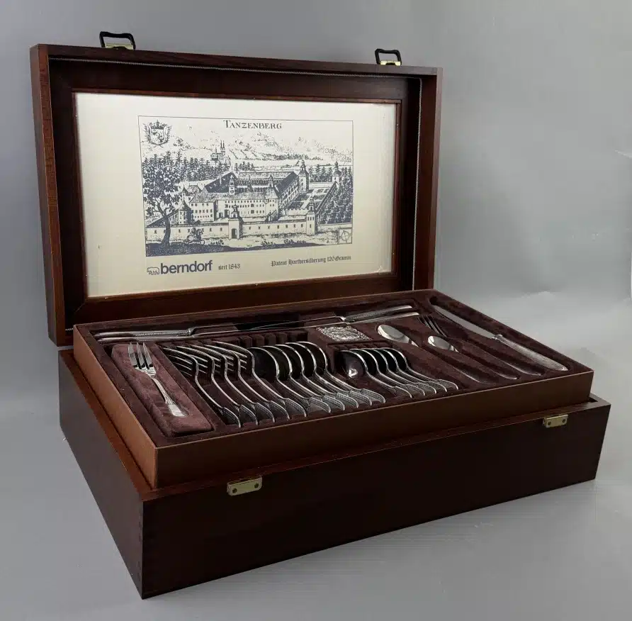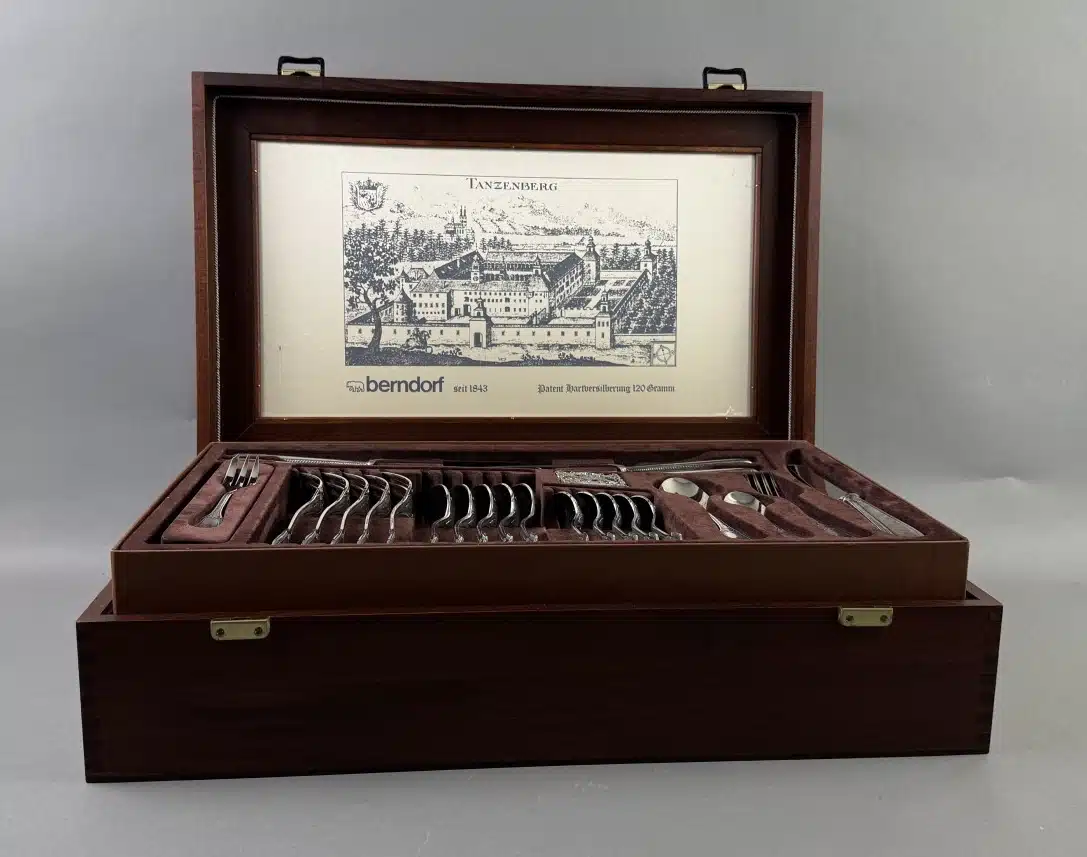 Berndorf – Vorspeise-, Hauptspeise- Besteck für 6 Personen, Metall versilbert, je 6 Messer, Gabeln, Löffel, Kaffeelöffel und Kuchengabeln (im Seitenfach) in Holz Besteckkasten, Firmenzeichen, Monogramm, Siehe Bilder