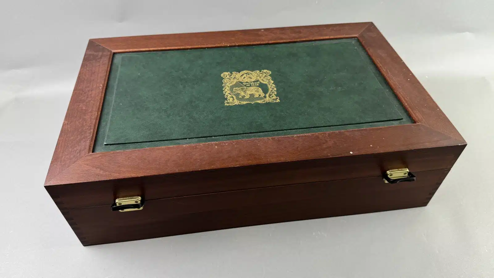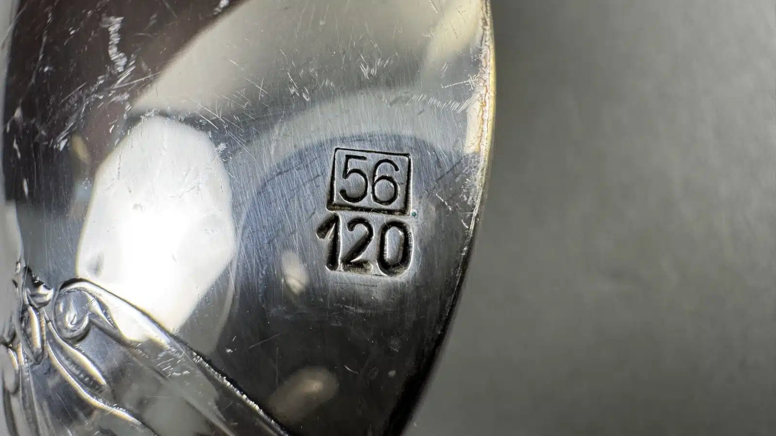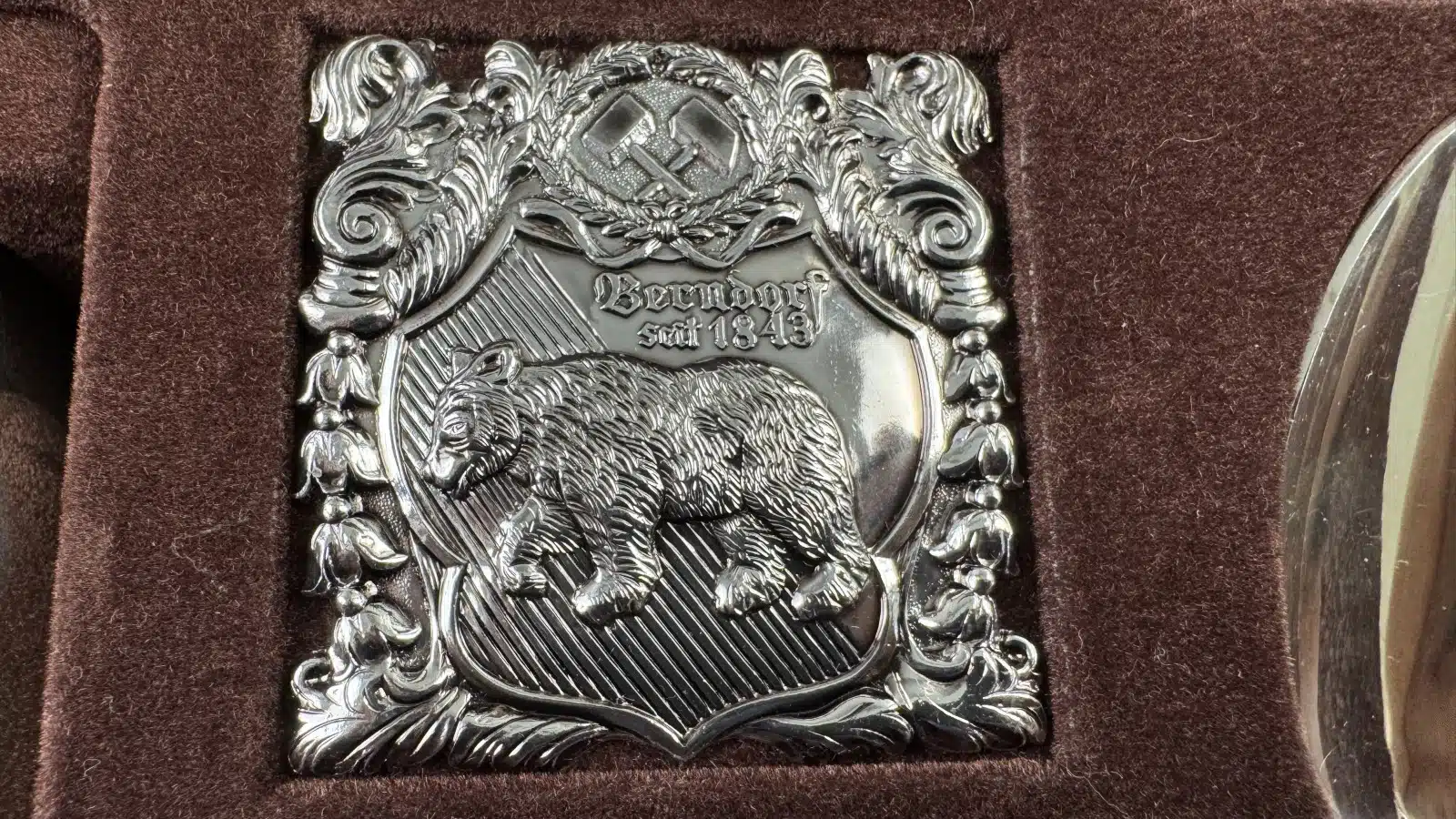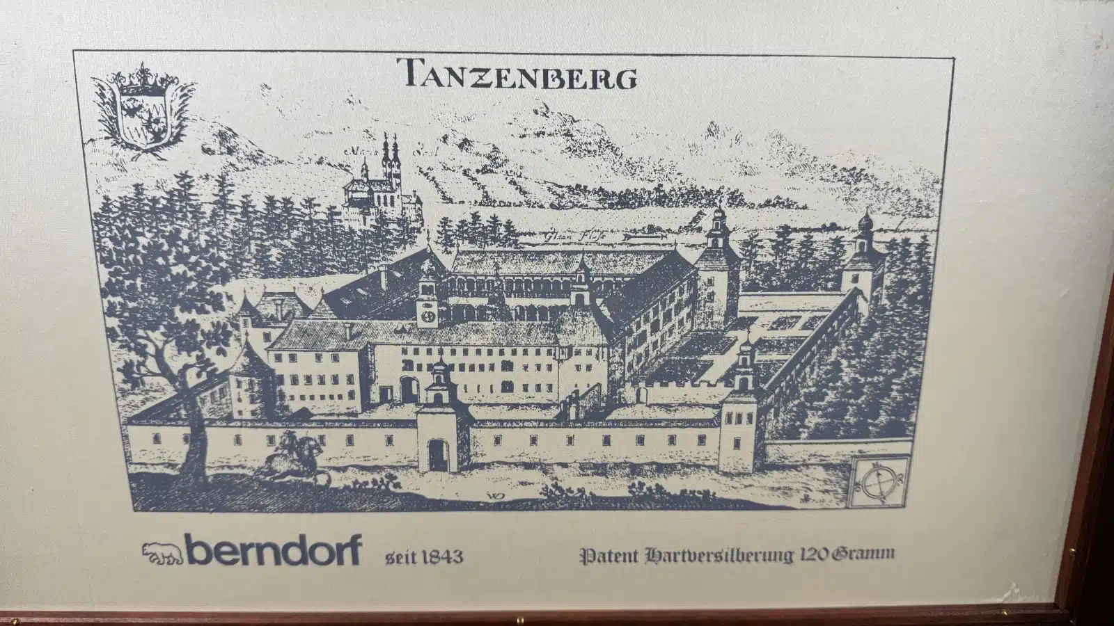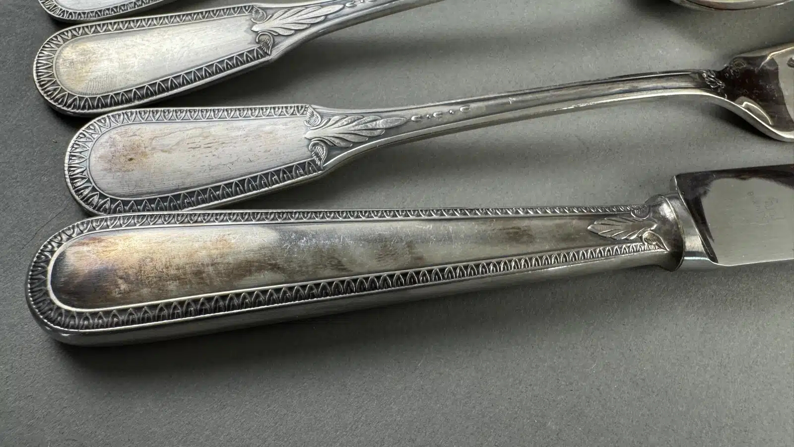 Berndorf – Vorspeise-, Hauptspeise- Besteck für 6 Personen, Metall versilbert, je 6 Messer, Gabeln, Löffel, Kaffeelöffel und Kuchengabeln (im Seitenfach) in Holz Besteckkasten, Firmenzeichen, Monogramm, Siehe Bilder