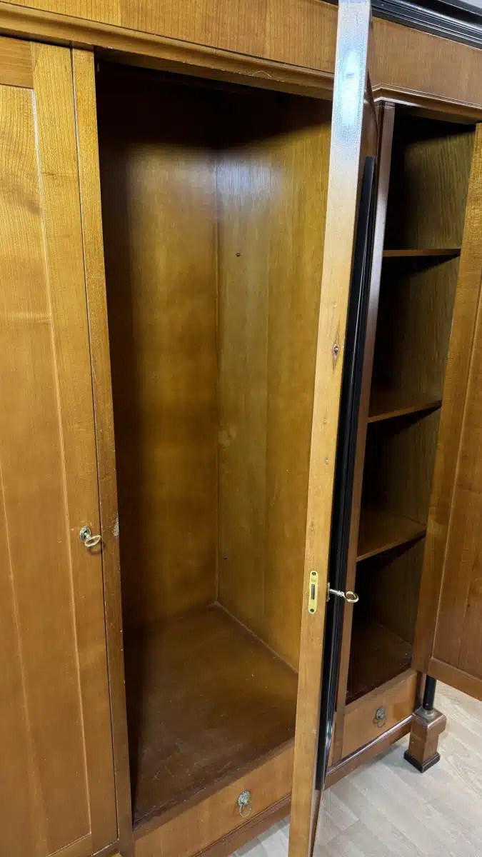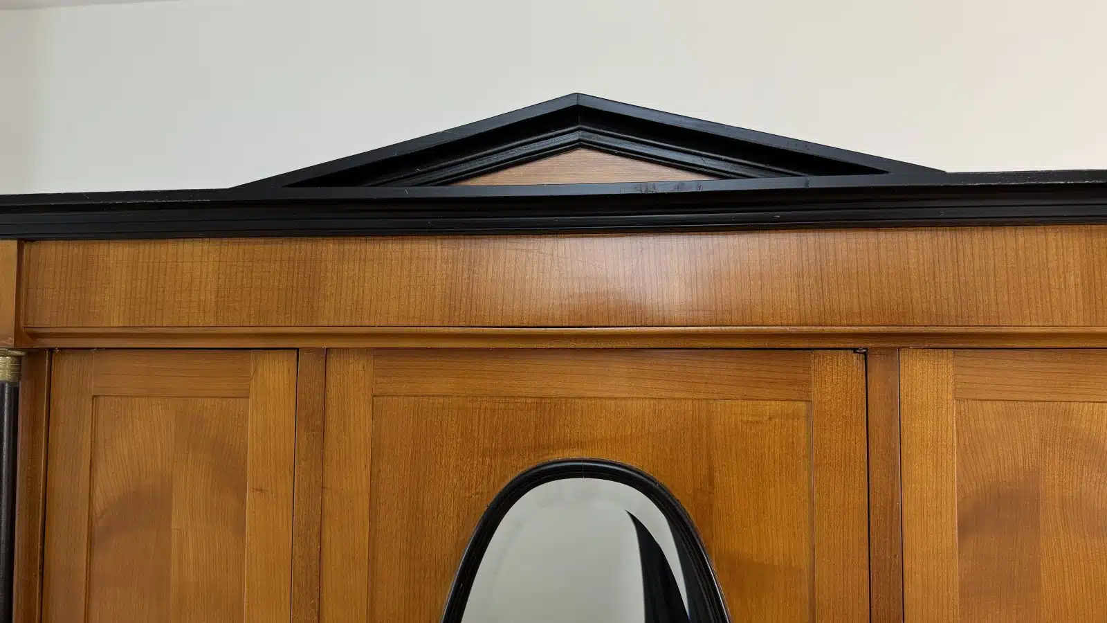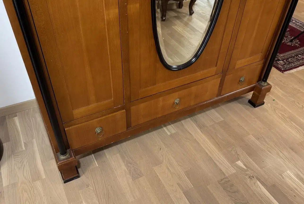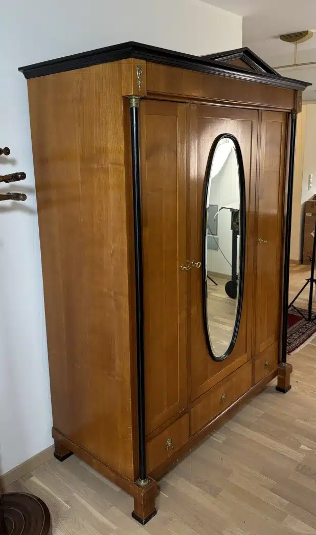 Biedermeier Stil Schrank, mit Spiegel und scwarz lackierten Säulen – Messing Appliken und Löwenköpfen siehe Bilder 147×70 cm H 205 cm