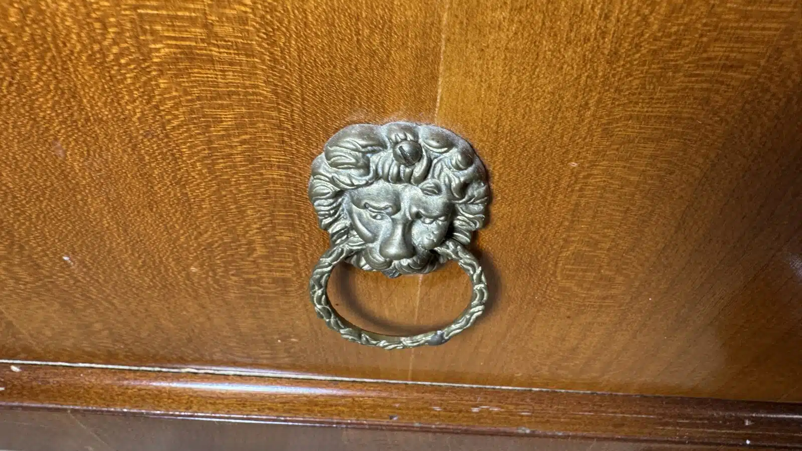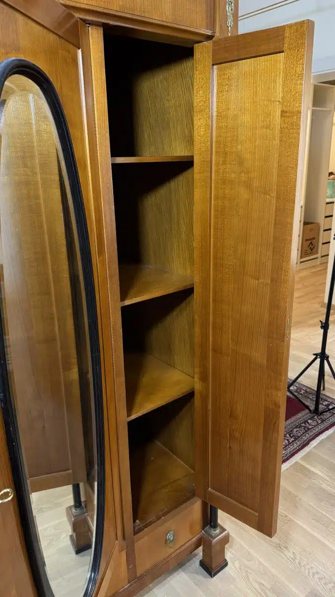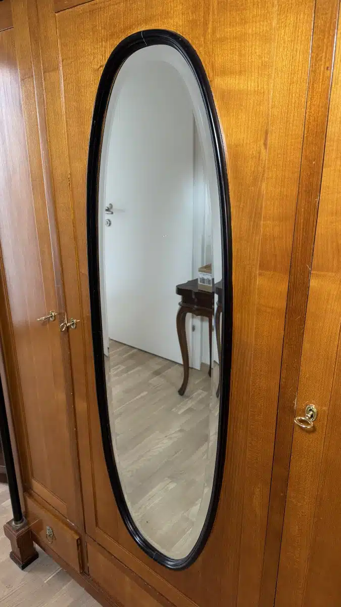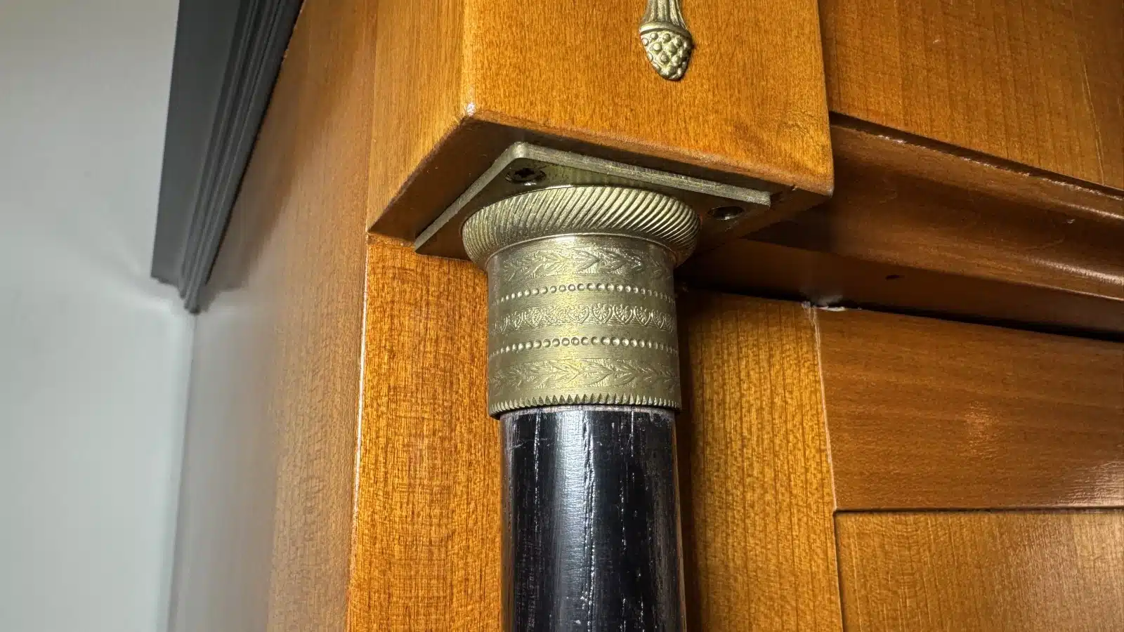 Biedermeier Stil Schrank, mit Spiegel und scwarz lackierten Säulen – Messing Appliken und Löwenköpfen siehe Bilder 147×70 cm H 205 cm
