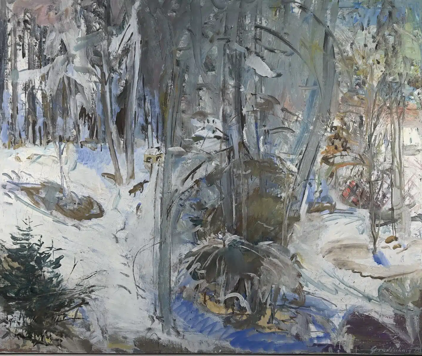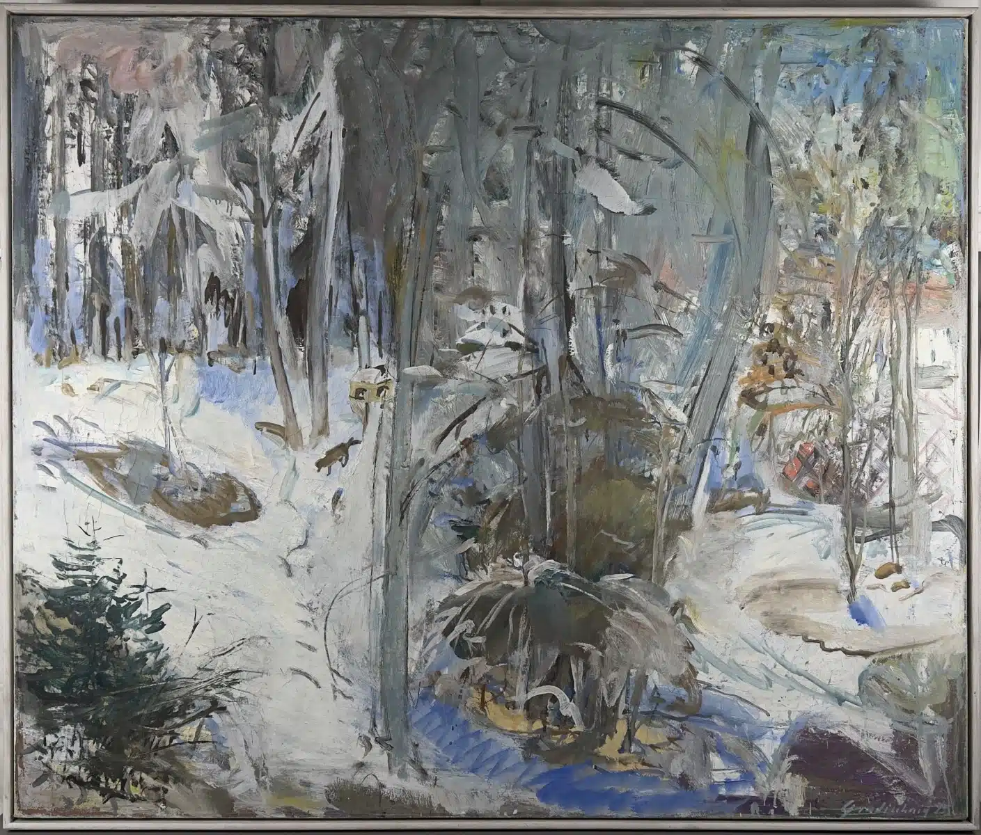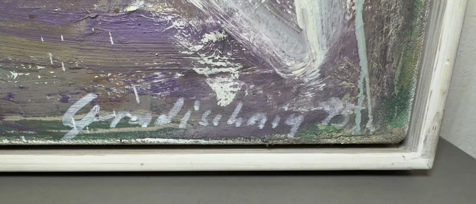 Ernst Gradischnig (Wiendorf, Kärnten 1949 geb.) Ausblick von seinem Atelier, Öl auf Leinwand, Schattenfugenrahmen, 119×98 cm