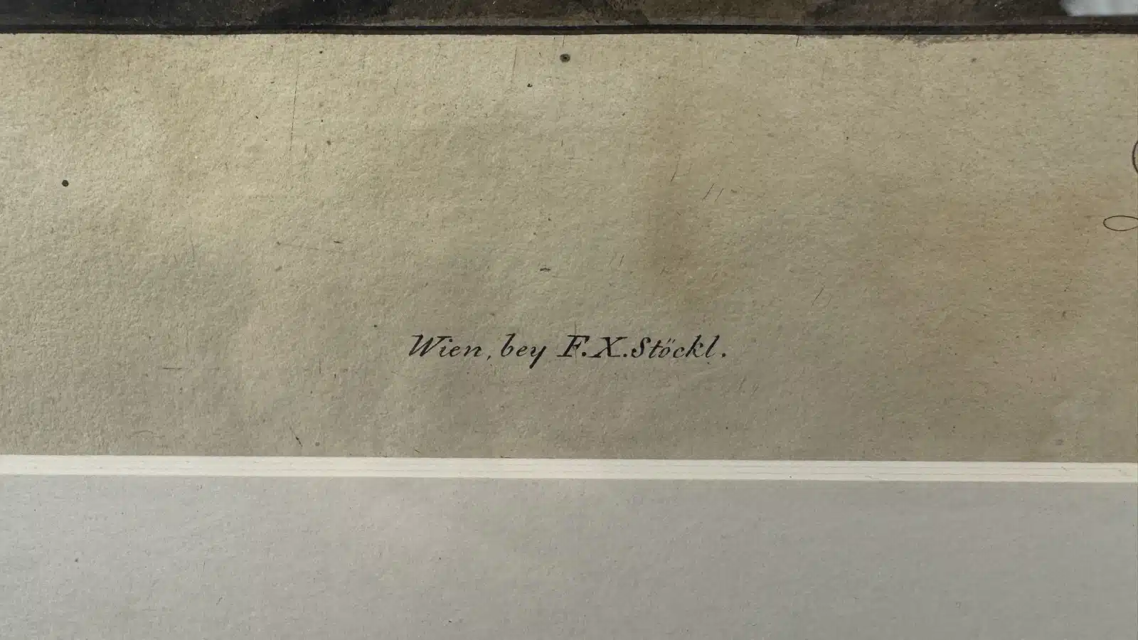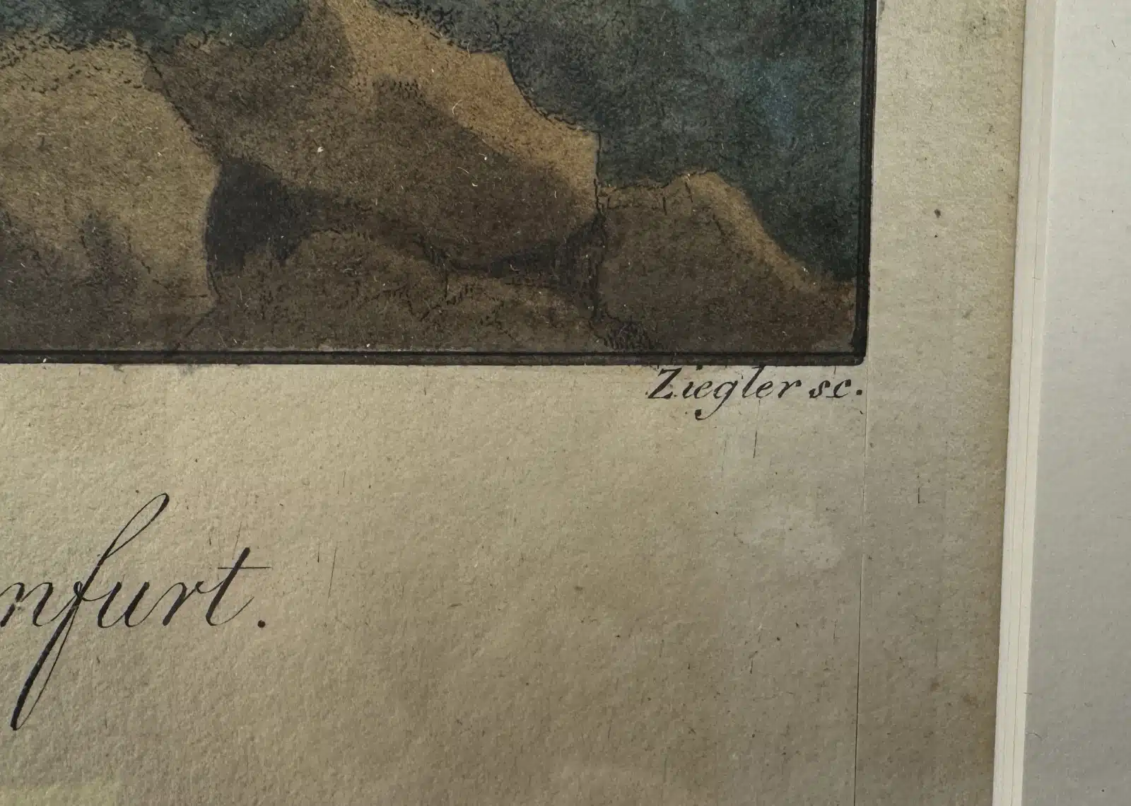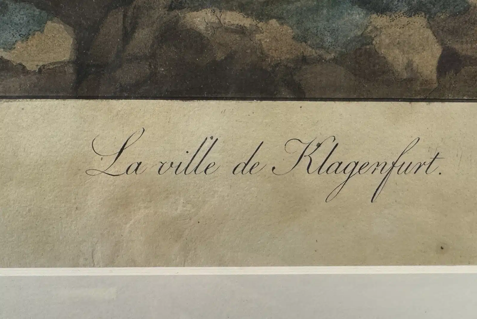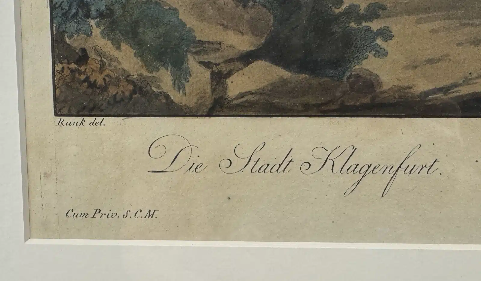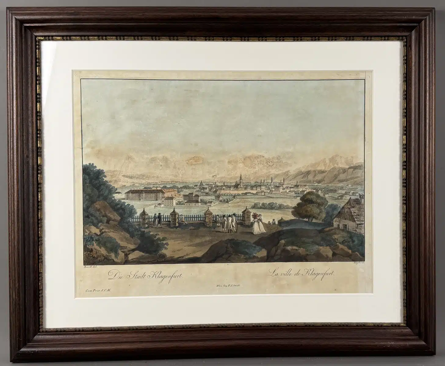 Ferdinand Runk (Freiburg 1764 – 1834 Wien) Maler Johann Ziegler (Meiningen 1749-1802 Wien, Die Stadt Klagenfurt, kolorierte Umrissradierung, in der Platte signiert „Runk del.“ – „Ziegler“, Wien, um 1810, Tusche-Passepartoutlinien, 43×33 cm gerahmt verglast gesamt 61×51 cm leichte Fehlstellen,