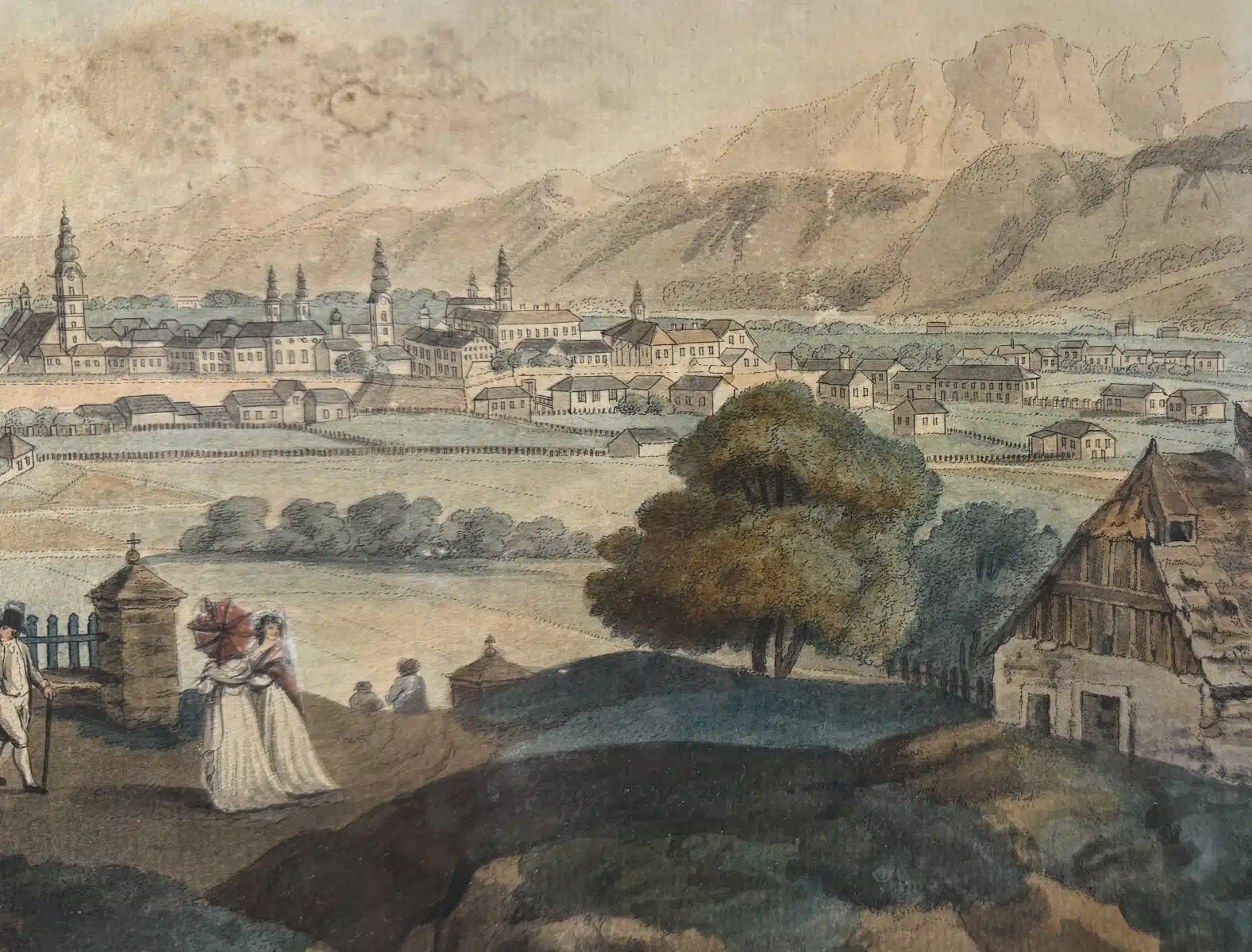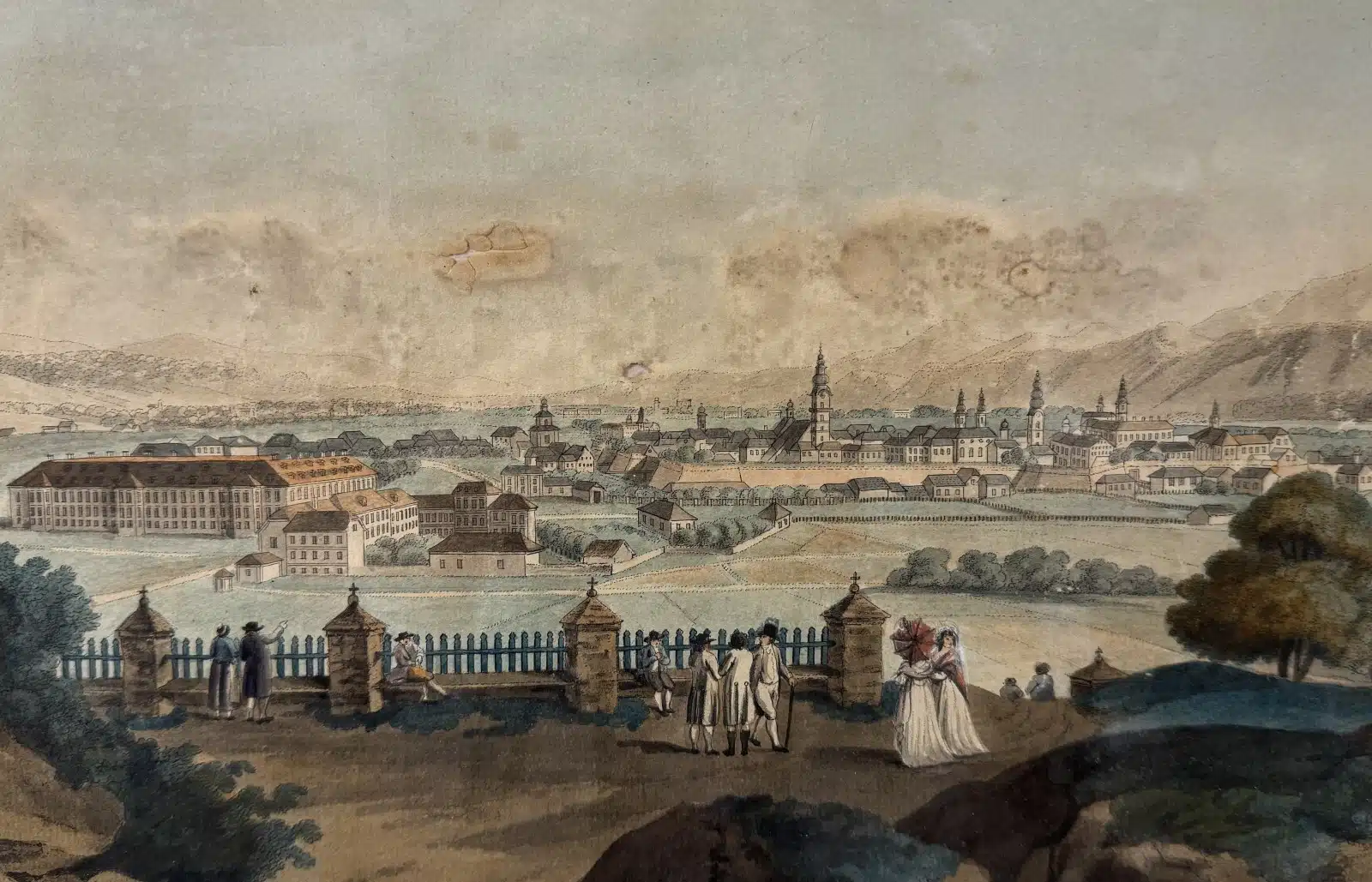 Ferdinand Runk (Freiburg 1764 – 1834 Wien) Maler Johann Ziegler (Meiningen 1749-1802 Wien, Die Stadt Klagenfurt, kolorierte Umrissradierung, in der Platte signiert „Runk del.“ – „Ziegler“, Wien, um 1810, Tusche-Passepartoutlinien, 43×33 cm gerahmt verglast gesamt 61×51 cm