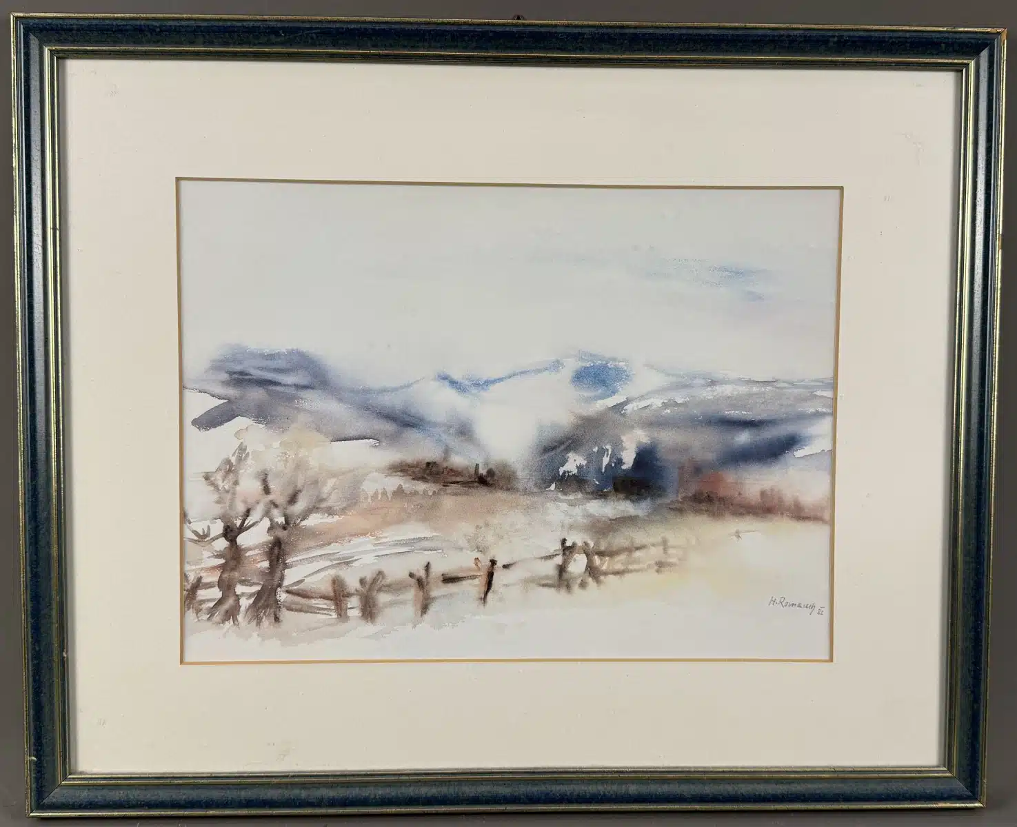 Hans Romauch (20. Jhdt.) „Landschaft“, signiert H. Romauch, datiert 82, Aquarell auf Papier, 33×24 cm, verglast, gerahmt gesamt 48×39 cm