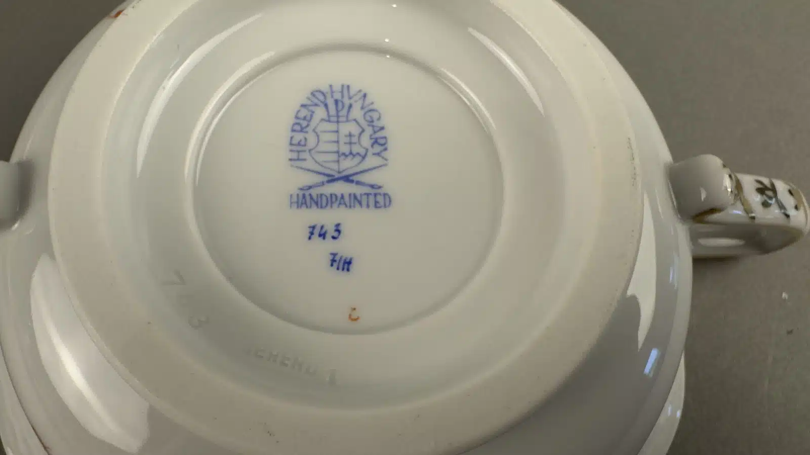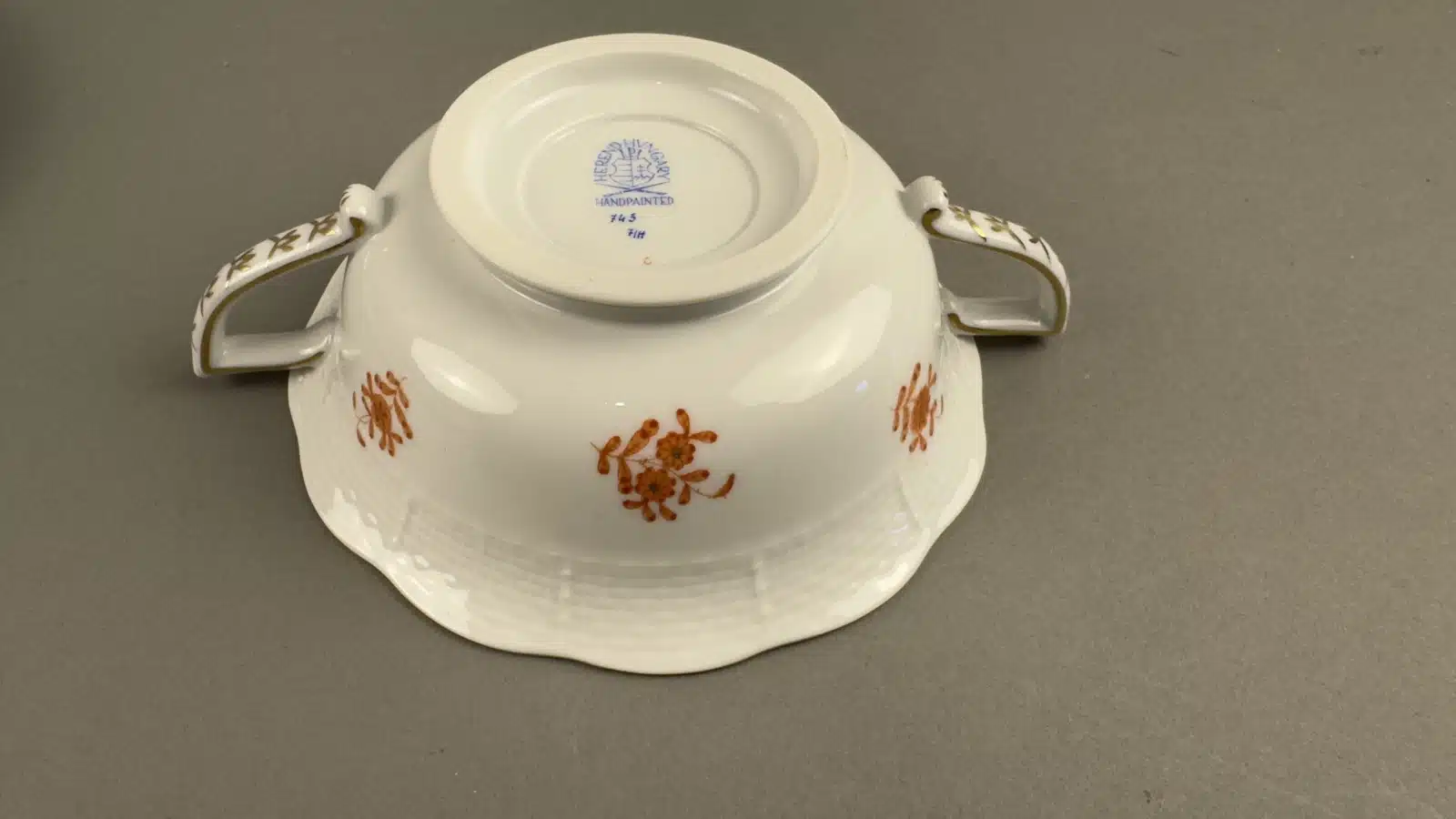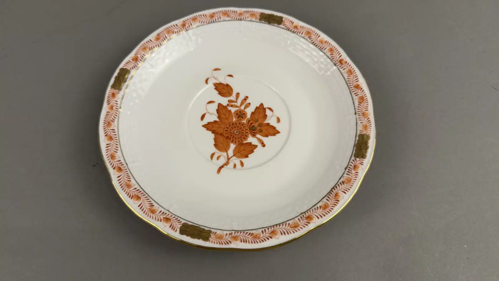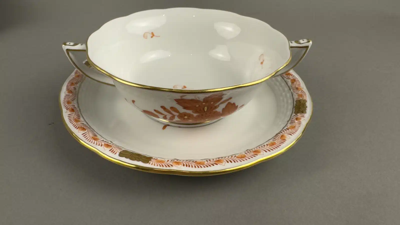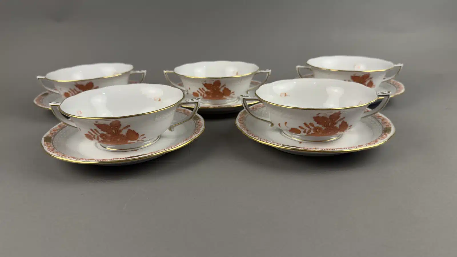 Herend – 5 gehenkelte Suppenschalen mit 5 Untertassen blaue Marke, Dekor Apponyi Orange