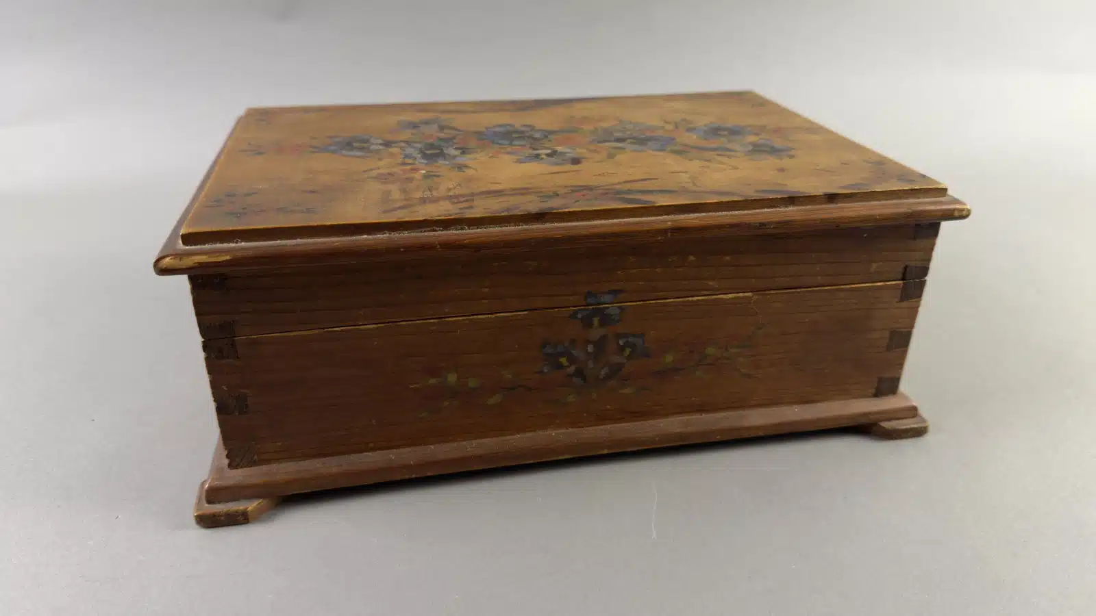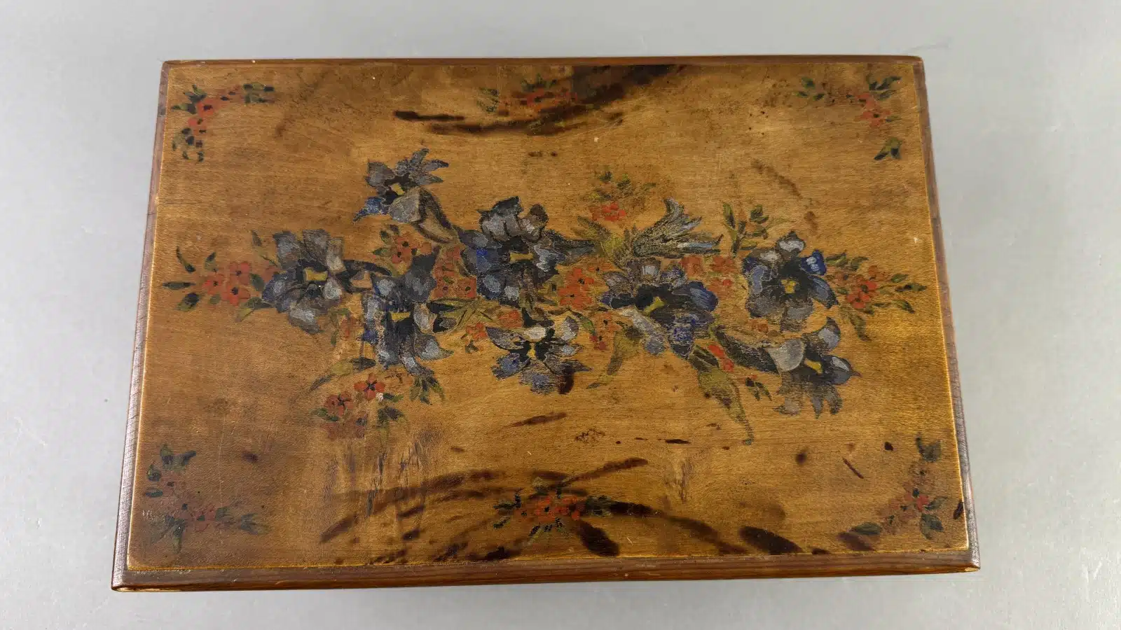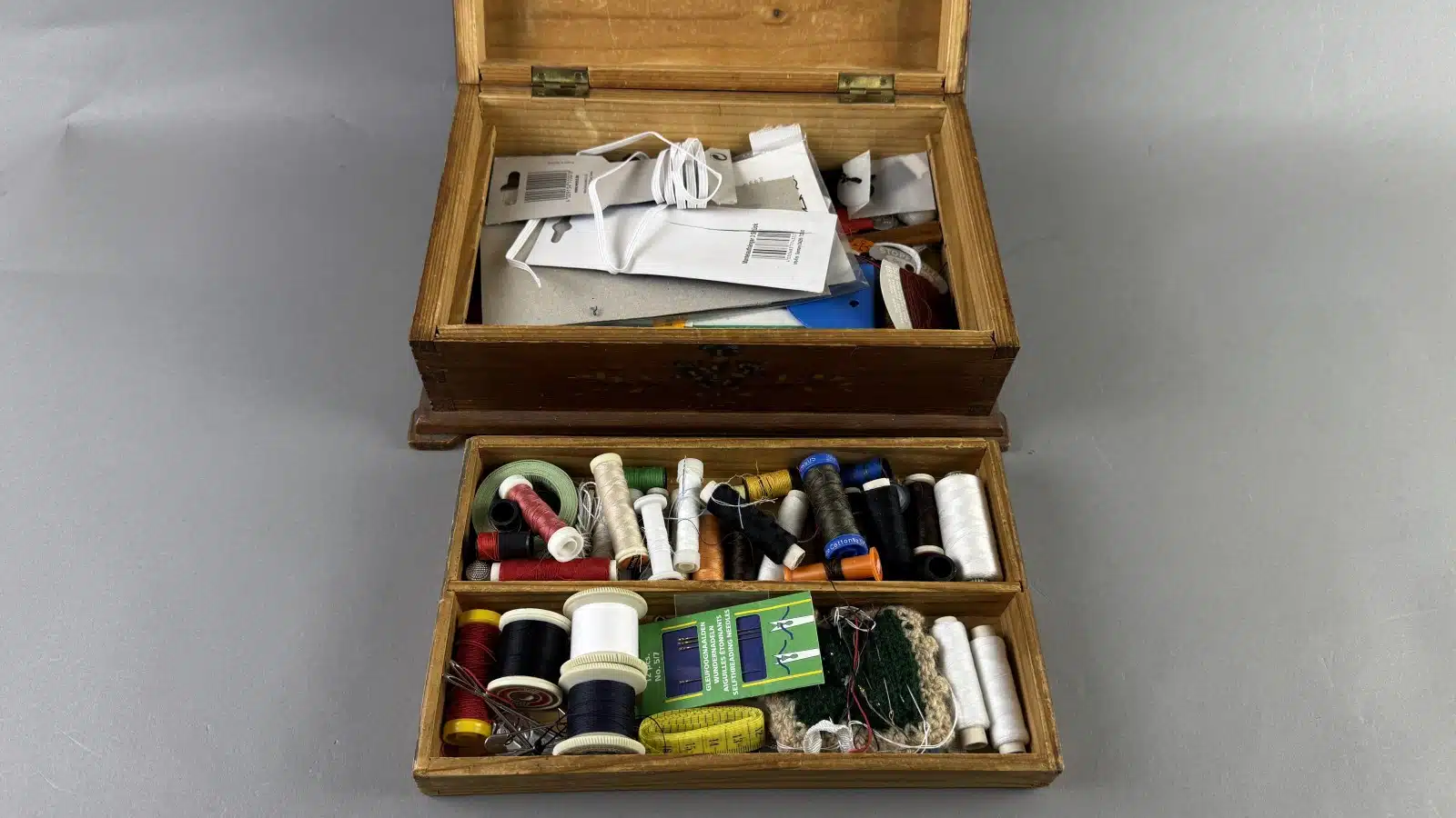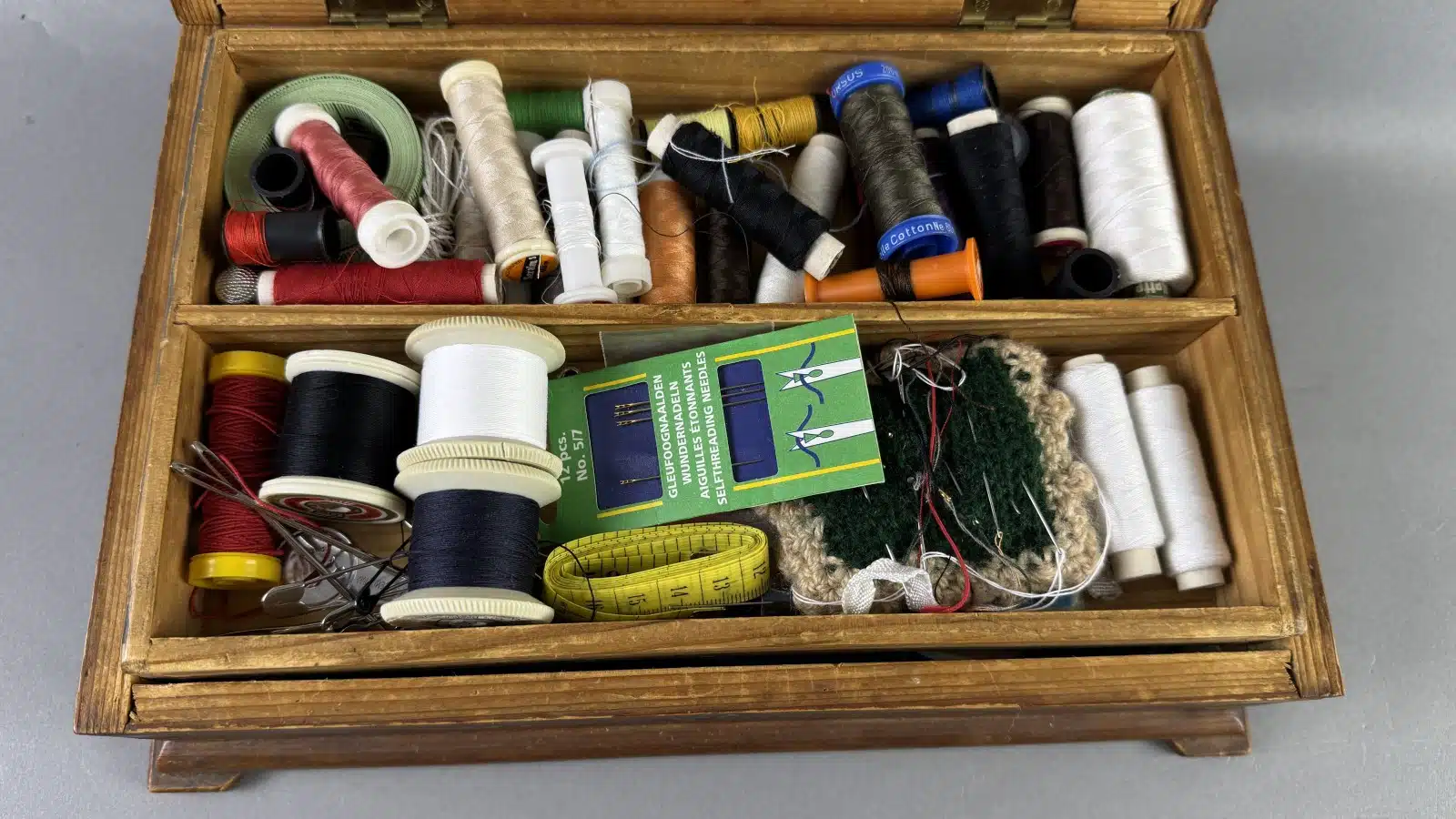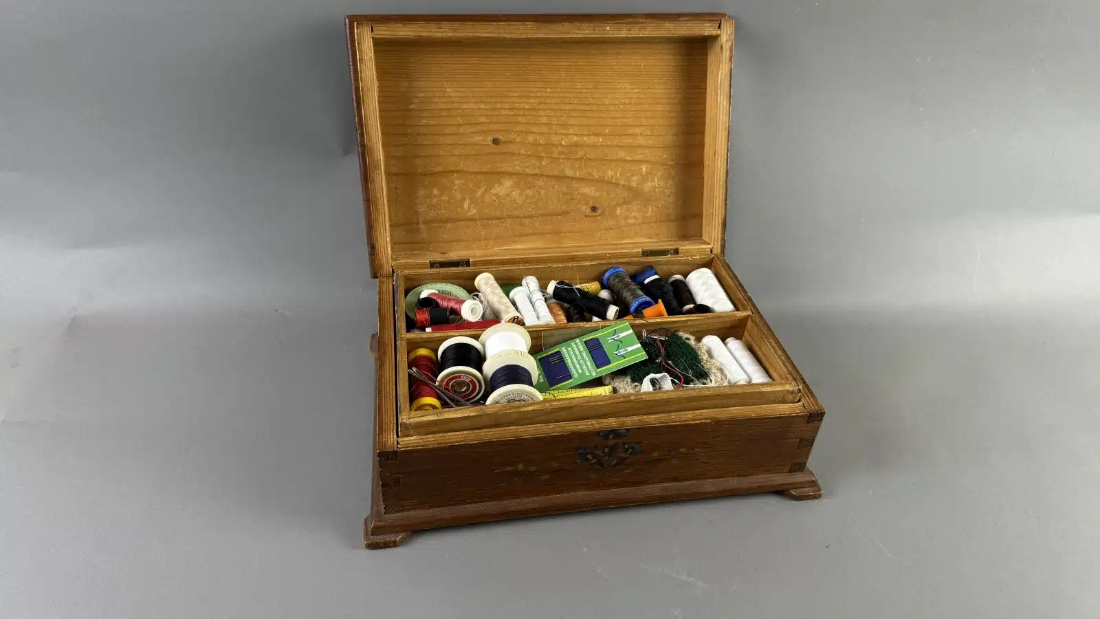 Holzschatulle Schmuckschatulle Nähzeugschatulle mit Inhalt 1. H. 20 Jh. 32×21 cm H 11 cm