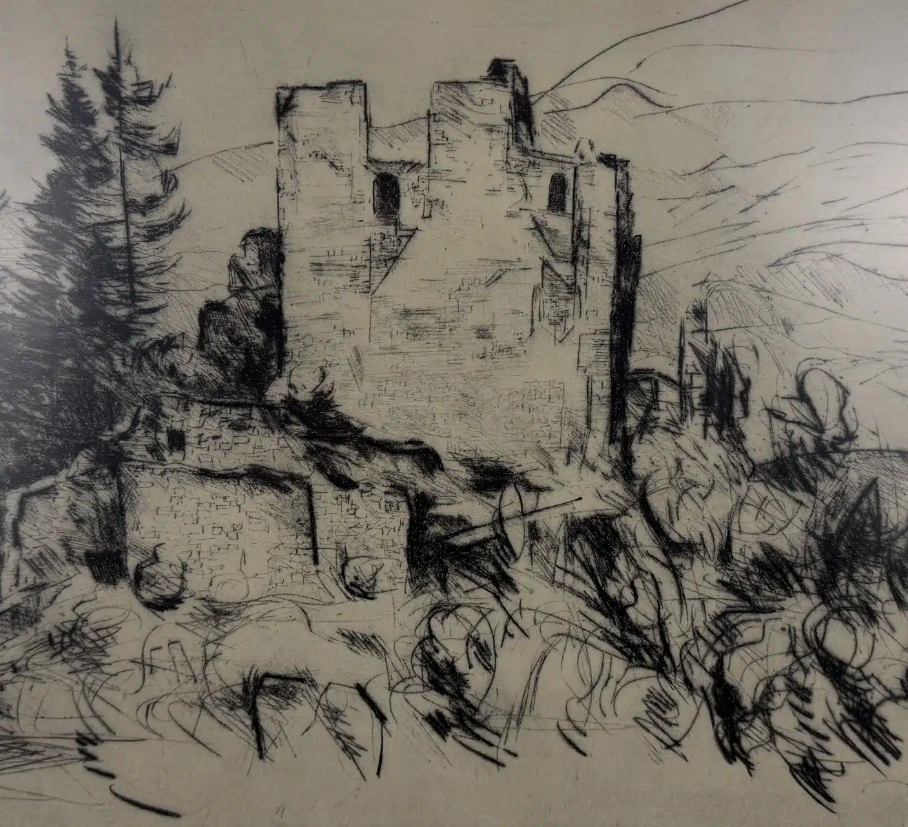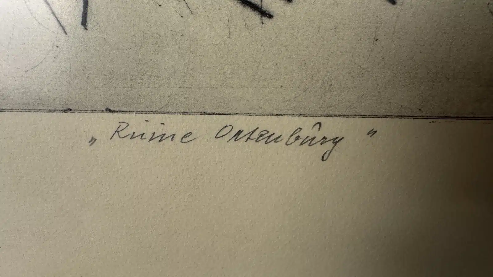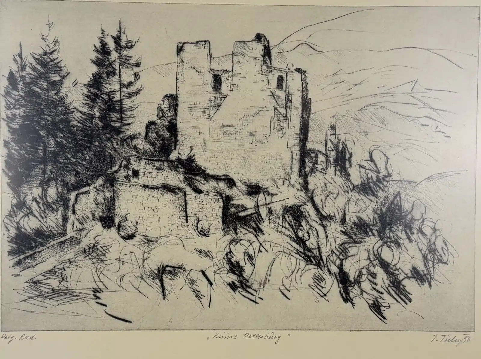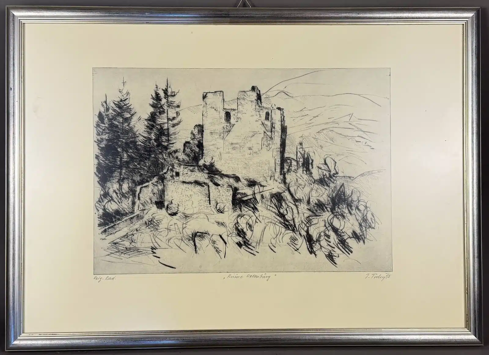 Josef Tichy (Pörtschach 1922-2001) Ruine Orthenburg, Radierung, signiert, datiert 1995, 26x25cm Ramen 56x40cm