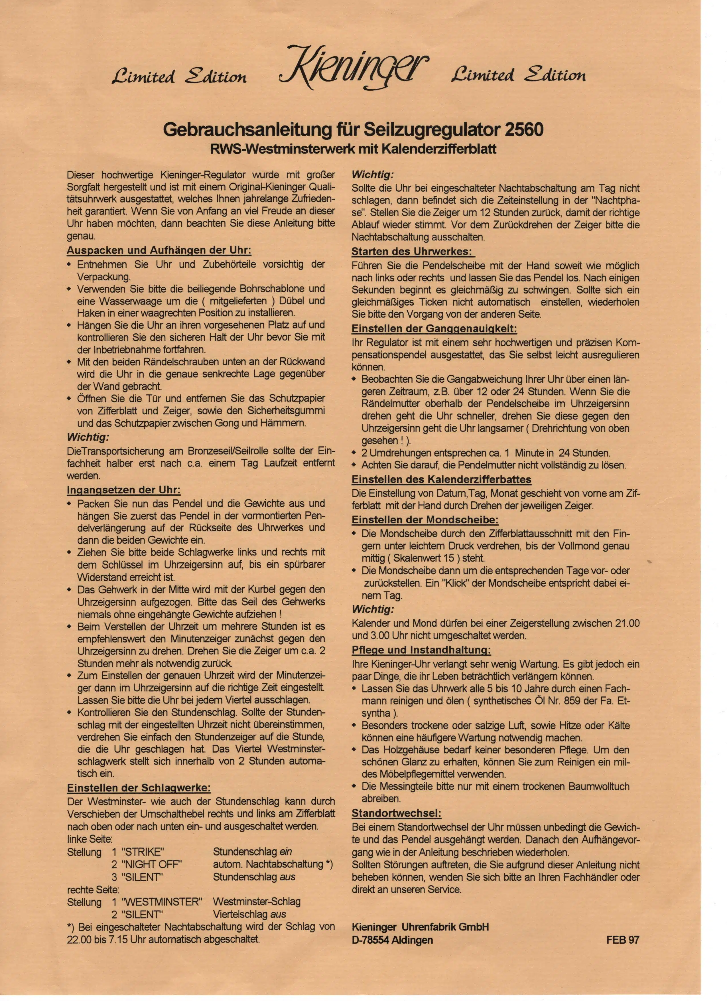Kieninger Wandpendeluhr, Limitierte Auflage Nr. 365 – mit Zertifikat siehe Bilder