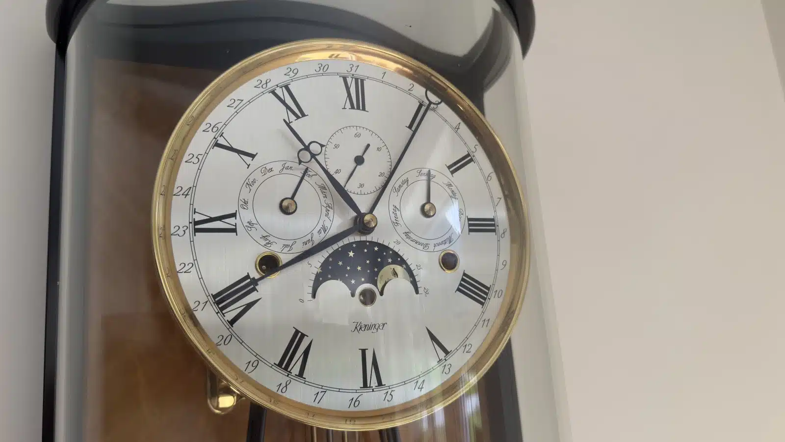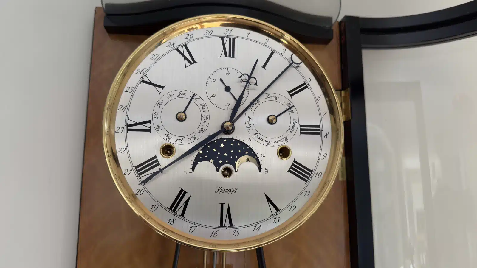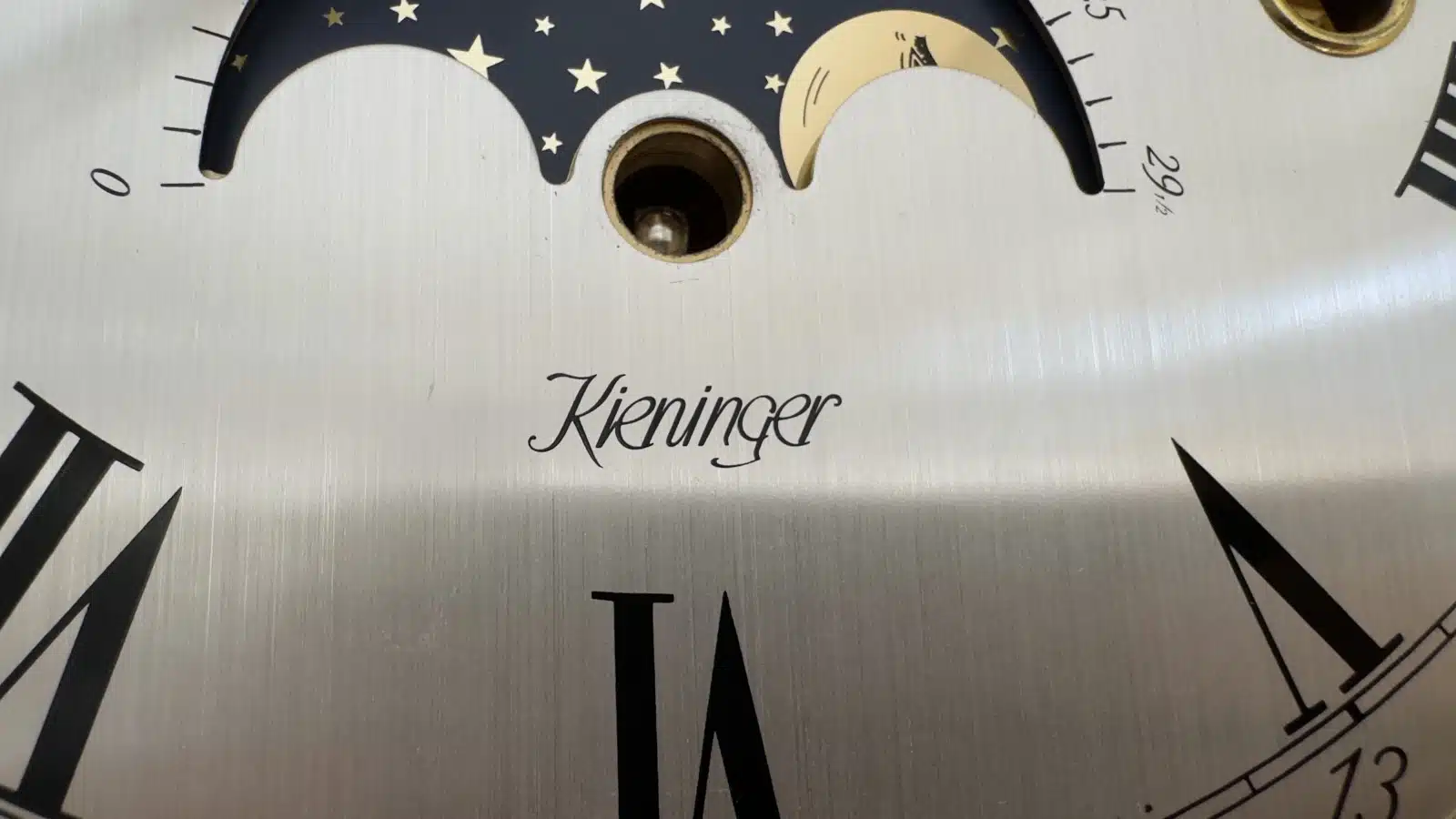 Kieninger Wandpendeluhr, mit Zertifikat siehe Bilder – Limitierte Auflage- Anzeige von kleiner Sekunde, Wochentag, Monat, Mondphase und Datum aus der Mitte, Grahamhemmung, Gewichtszug, Wochengang, 4/4 Stundenschlag auf 8 Tonstäbe, versilbertes Zifferblatt, gebläute Zeiger, facettiert verglaste Türe, 93 cm, keine Gewähr für Ganggenauigkeit und Dauerfunktion, 1 Pendel, 2 Gewichte, 1 Kurbel,