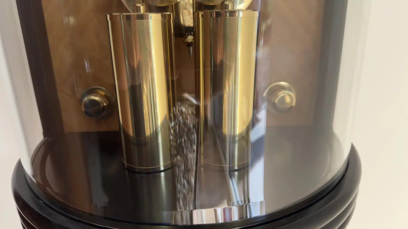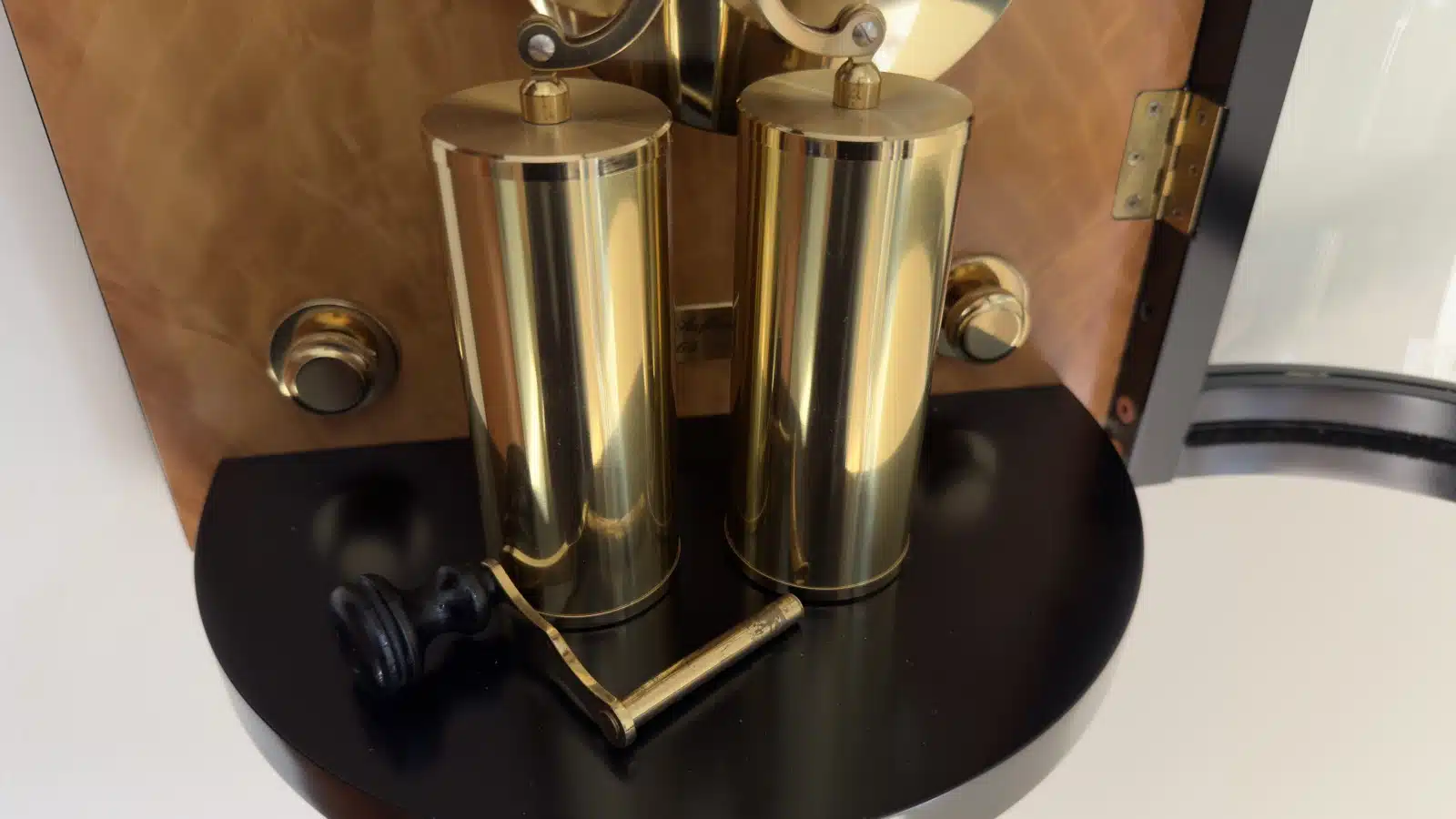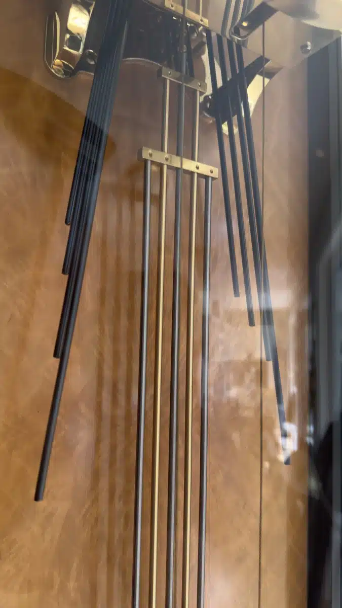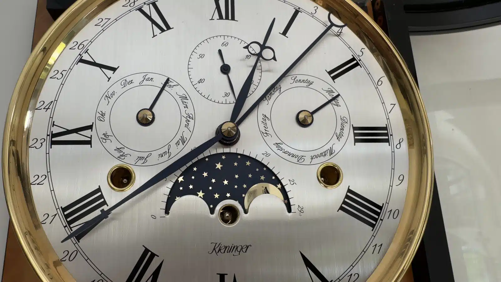 Kieninger Wandpendeluhr, mit Zertifikat siehe Bilder – Limitierte Auflage- Anzeige von kleiner Sekunde, Wochentag, Monat, Mondphase und Datum aus der Mitte, Grahamhemmung, Gewichtszug, Wochengang, 4/4 Stundenschlag auf 8 Tonstäbe, versilbertes Zifferblatt, gebläute Zeiger, facettiert verglaste Türe, 93 cm, keine Gewähr für Ganggenauigkeit und Dauerfunktion, 1 Pendel, 2 Gewichte, 1 Kurbel,