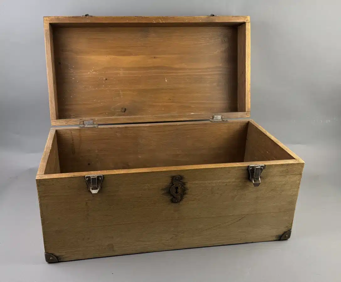 Kleiner Holzkoffer Truhe -Eichenholz gezapft mit Eisenbeschlägen – seitliche Tragegriffe, Schloss 60×30 cm H. 30 cm