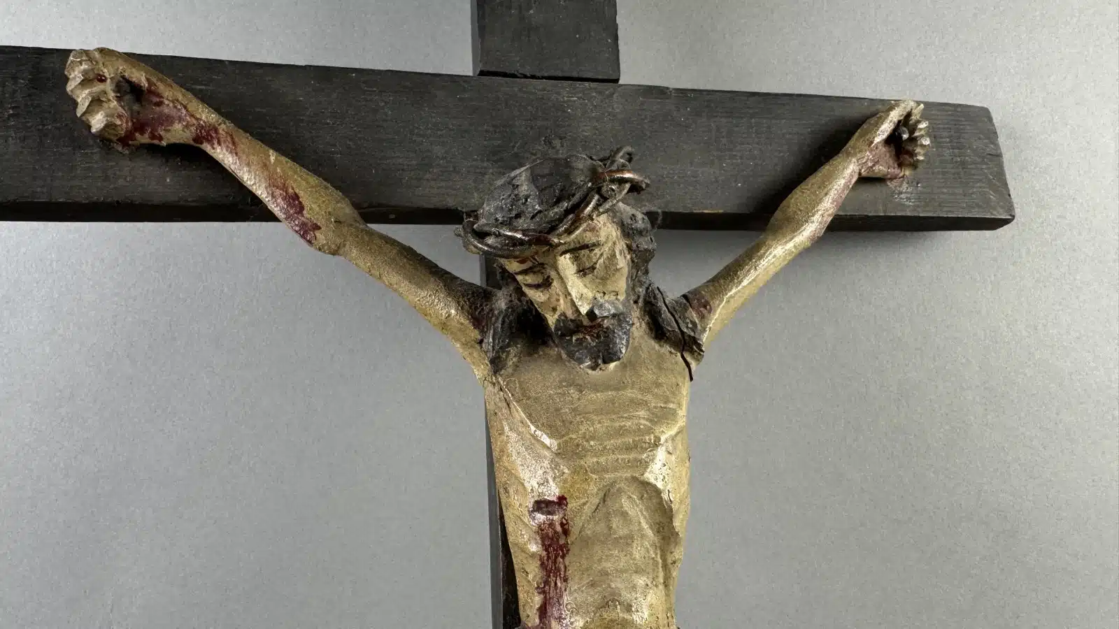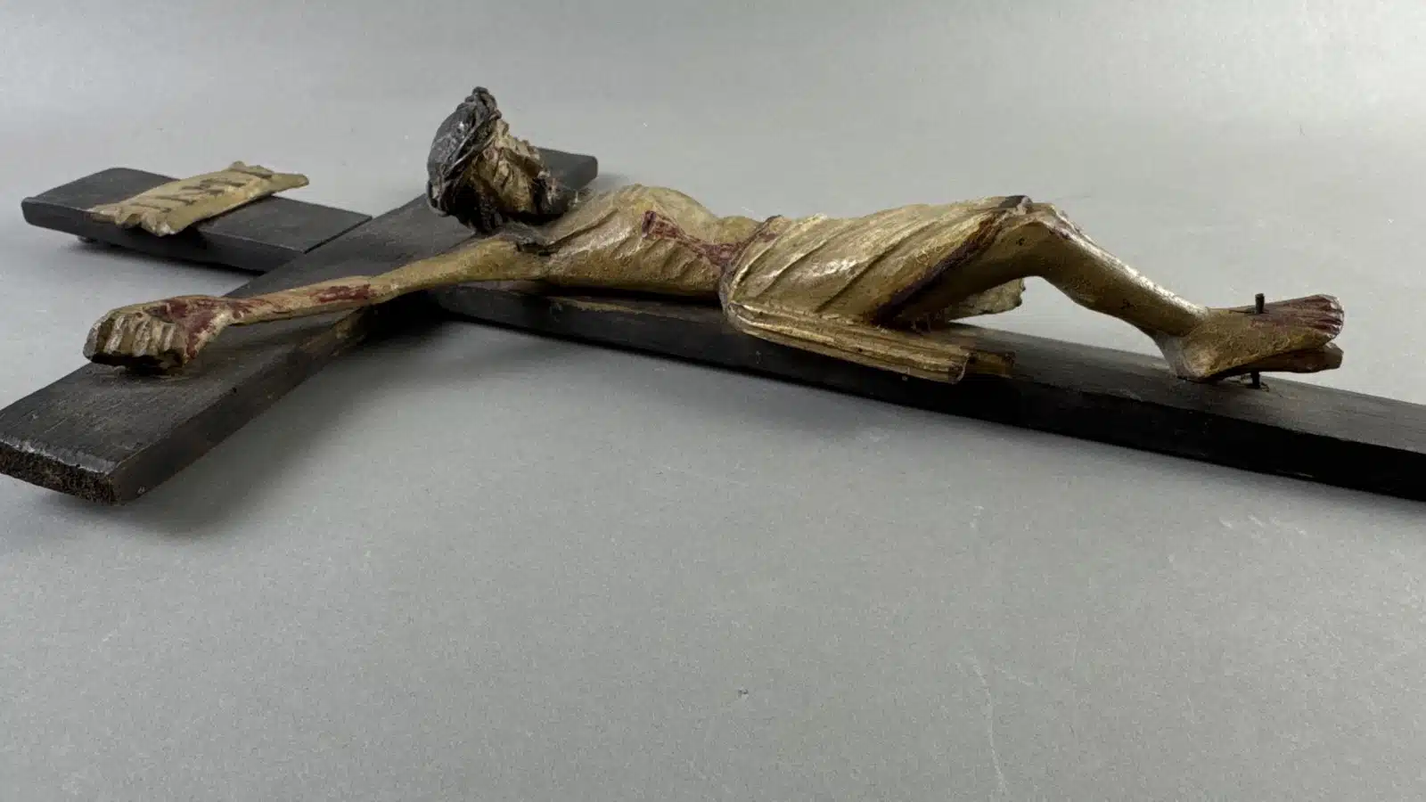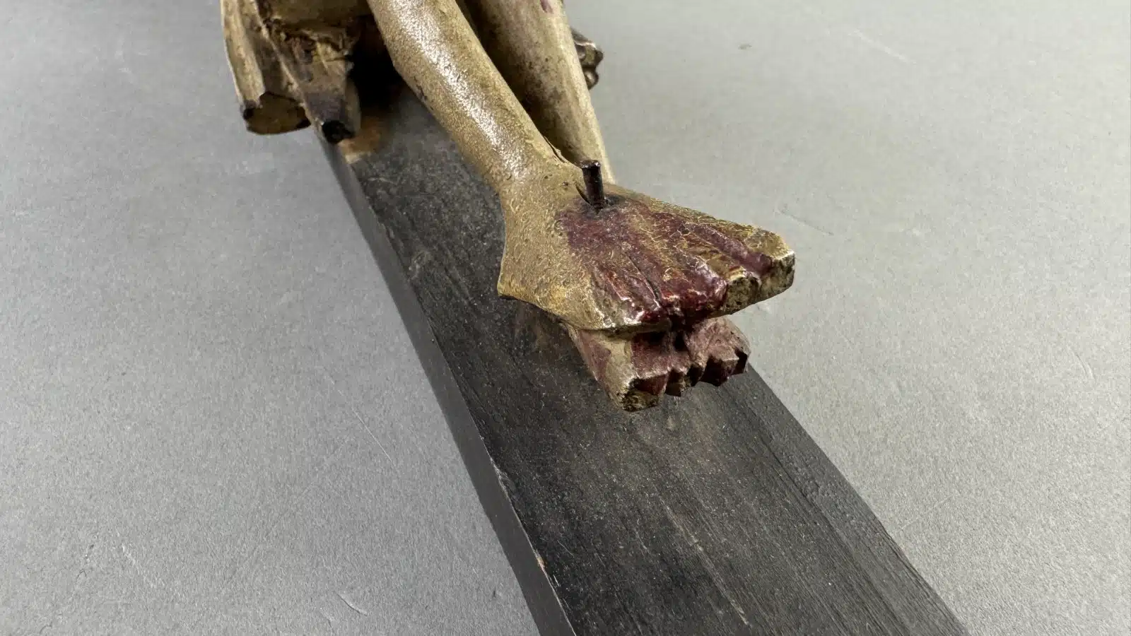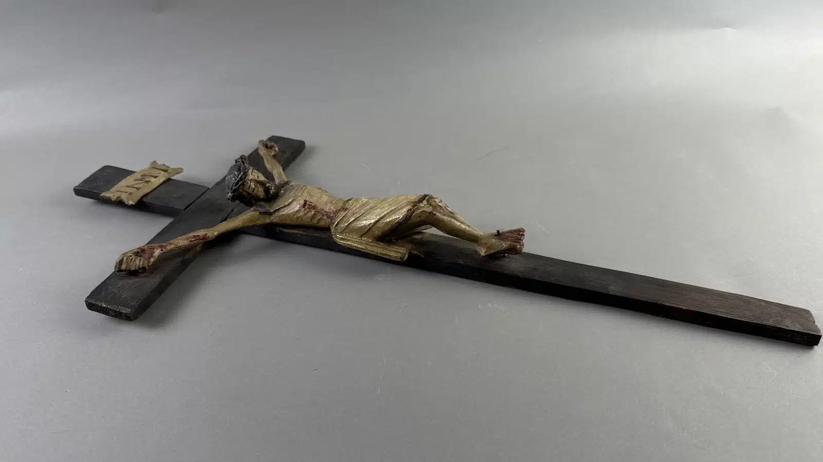 Kruzifix, 19. Jahrhundert Christuskorpus im Dreinageltypus geschnitzt, mit INRI-Tafel montiert, Gesamthöhe ca. 66 cm,