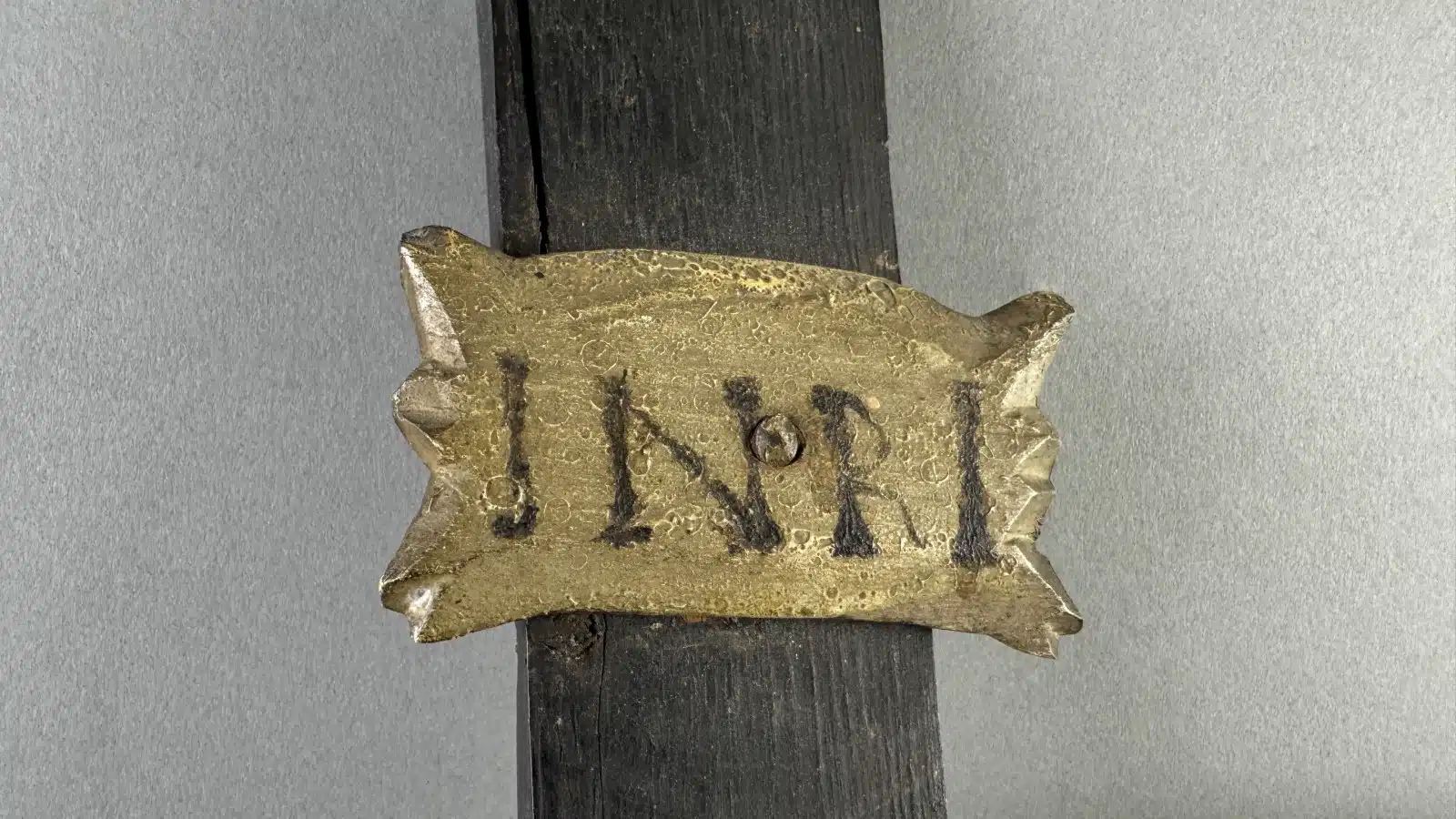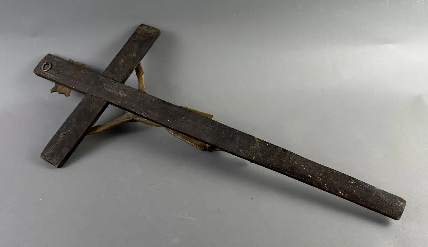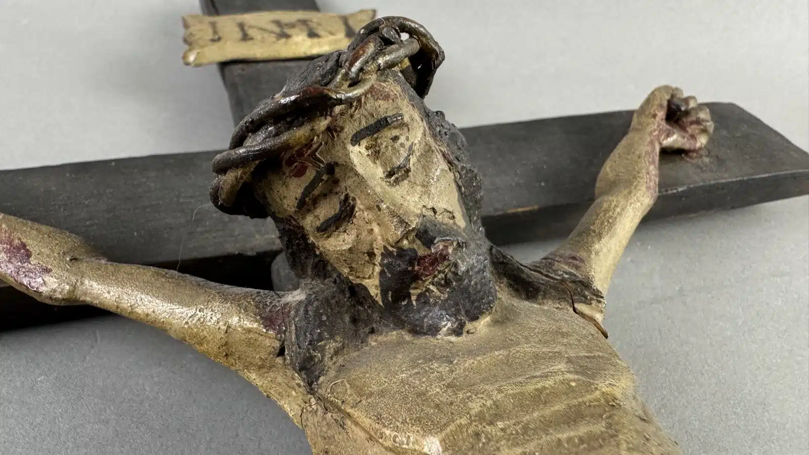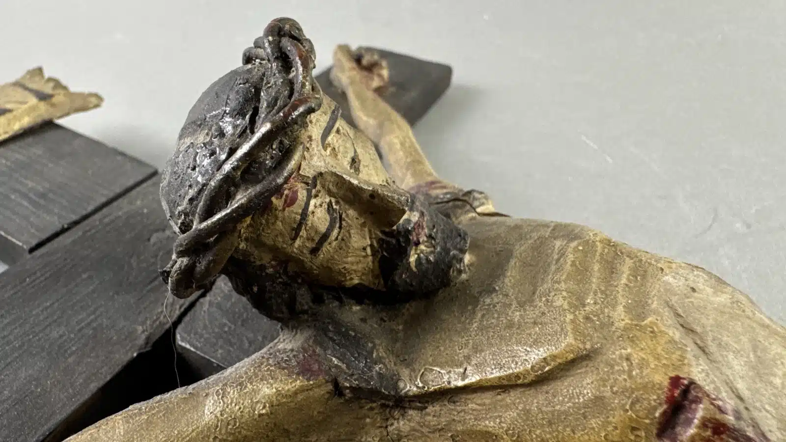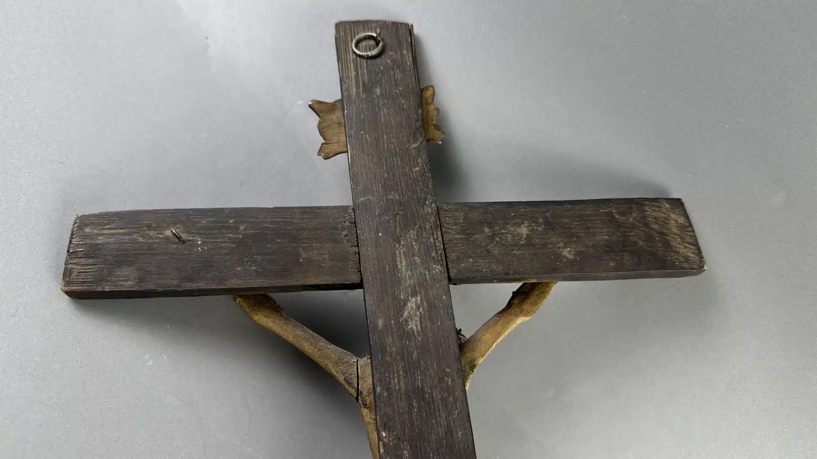Kruzifix, 19. Jahrhundert Christuskorpus im Dreinageltypus geschnitzt, mit INRI-Tafel montiert, Gesamthöhe ca. 66 cm,
