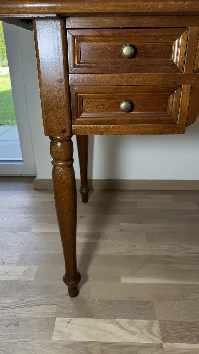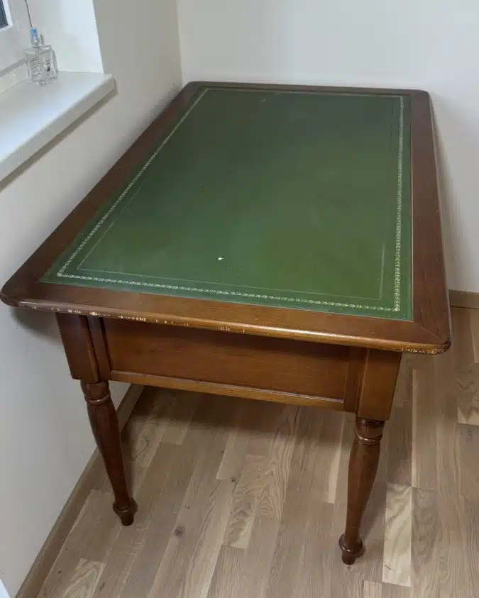 Schreibtisch – Schreibfläche mit grünem Belag, 5 Schubladen, eleganten gedrechselten Beine 126×77 cm H 79 cm