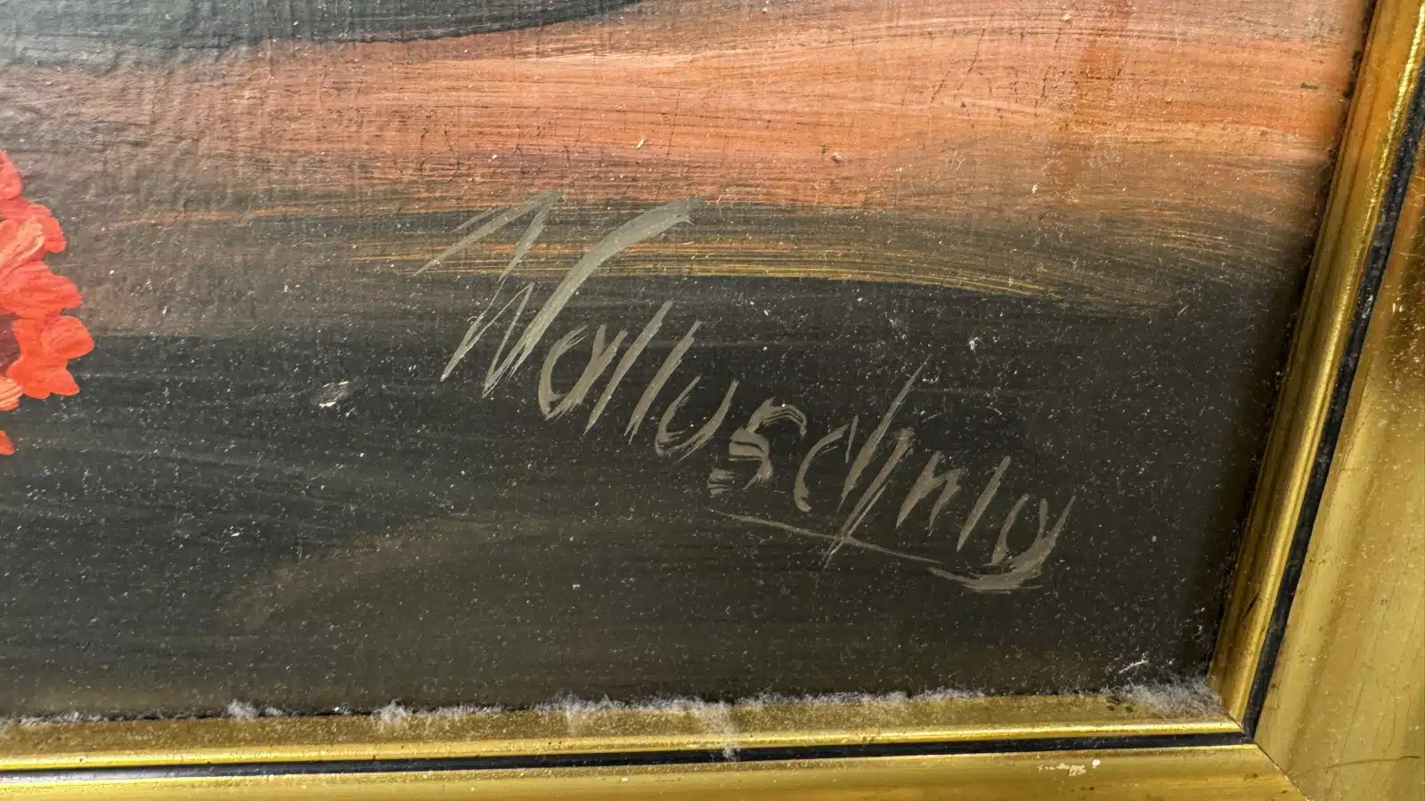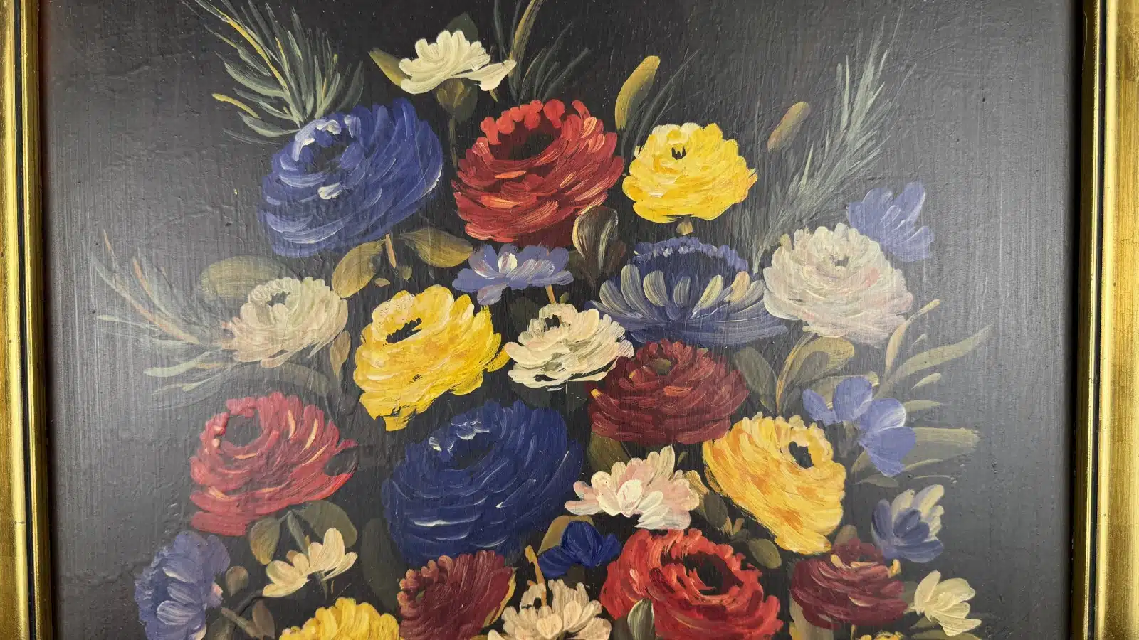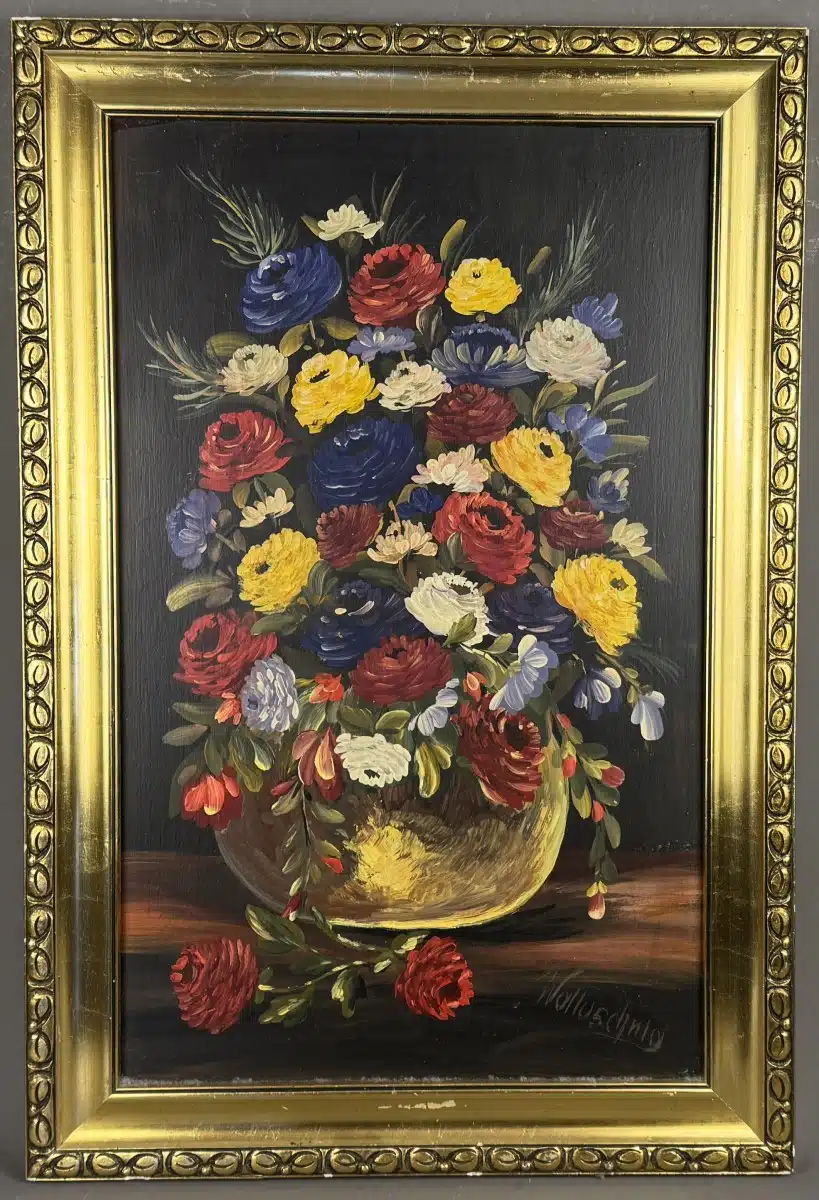 Stilleben, Öl auf Platte, signiert Walluschnig, 58x36cm Rahmen 70×47 cm