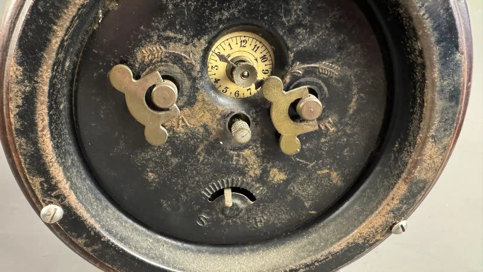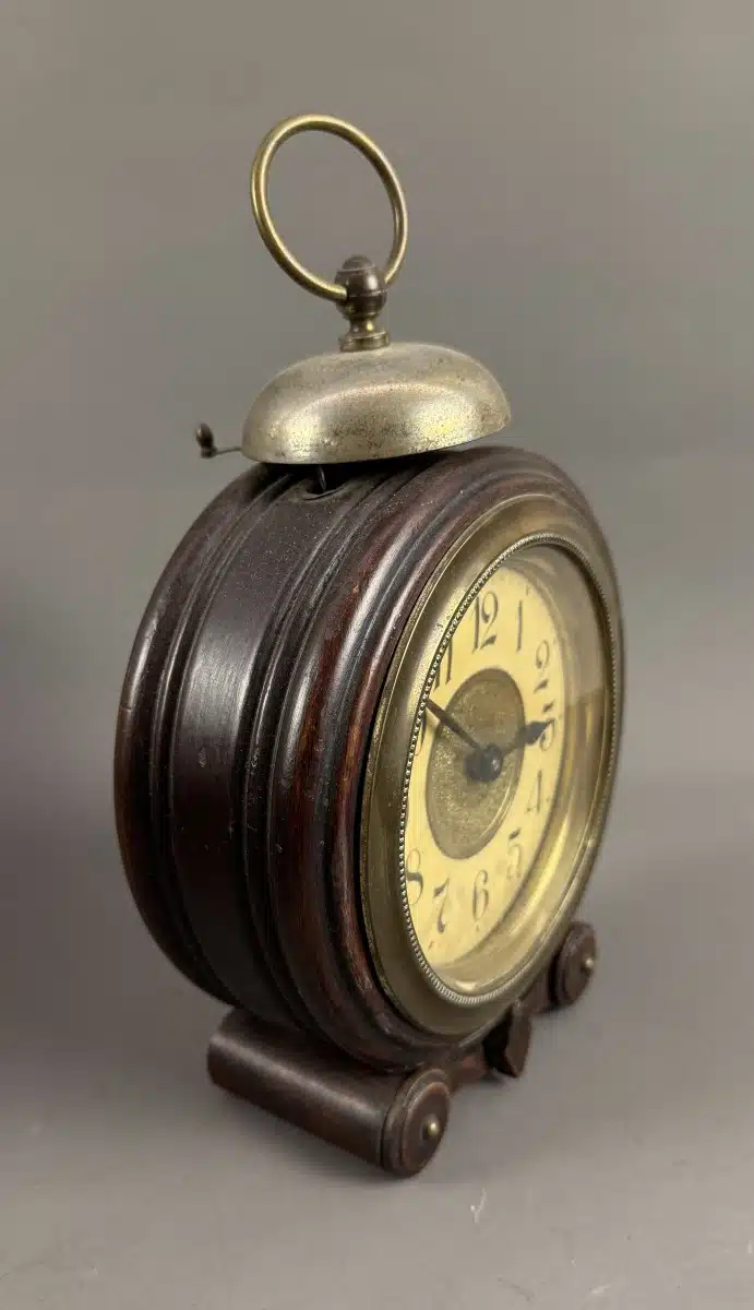 Switbert Lobisser – Aus persönlichem Besitz – antiker Wecker mit Holzgehäuse H 26 cm