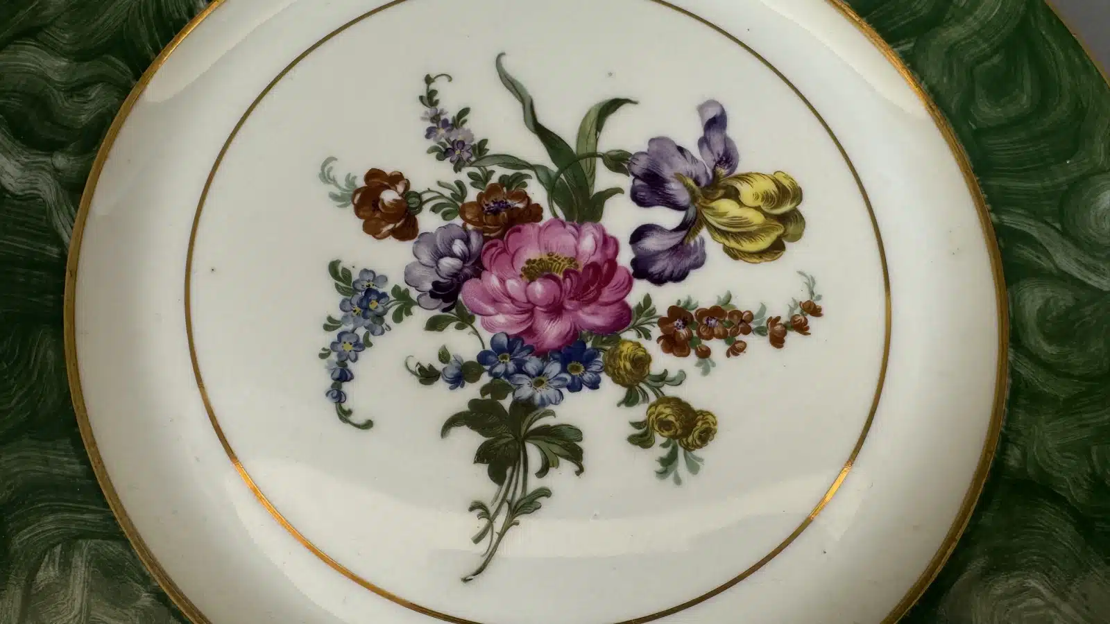 Switbert Lobisser – Aus persönlichem Besitz – handbemaltem Porzellan Teller, Zentrales Blumenbouquet auf weißem Grund mit einem breiten, grünen Rand, unterglasurblauer Bindenschild, Wiener Porzellan, Metalleinfassung, Dm. 27,5 cm