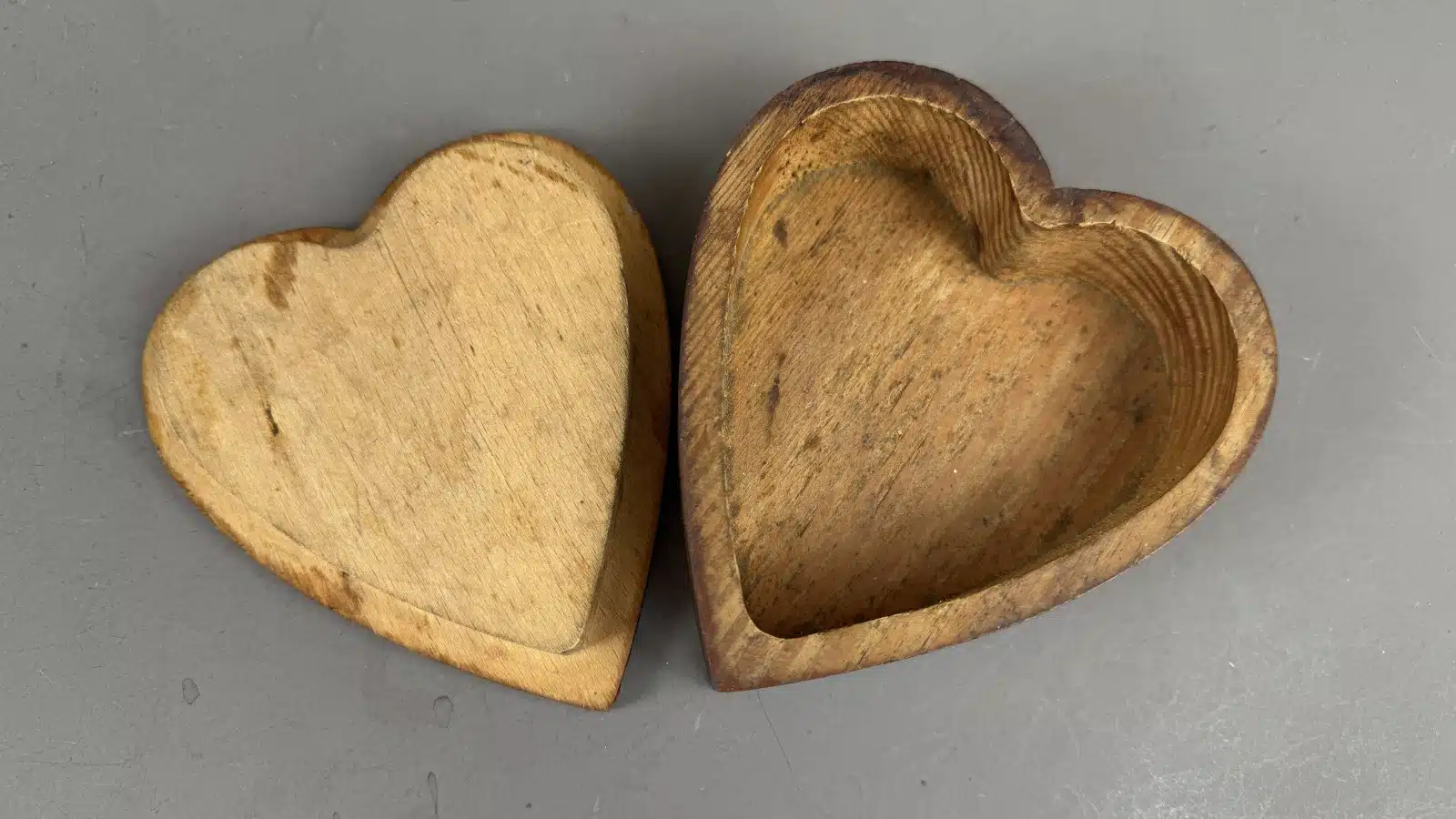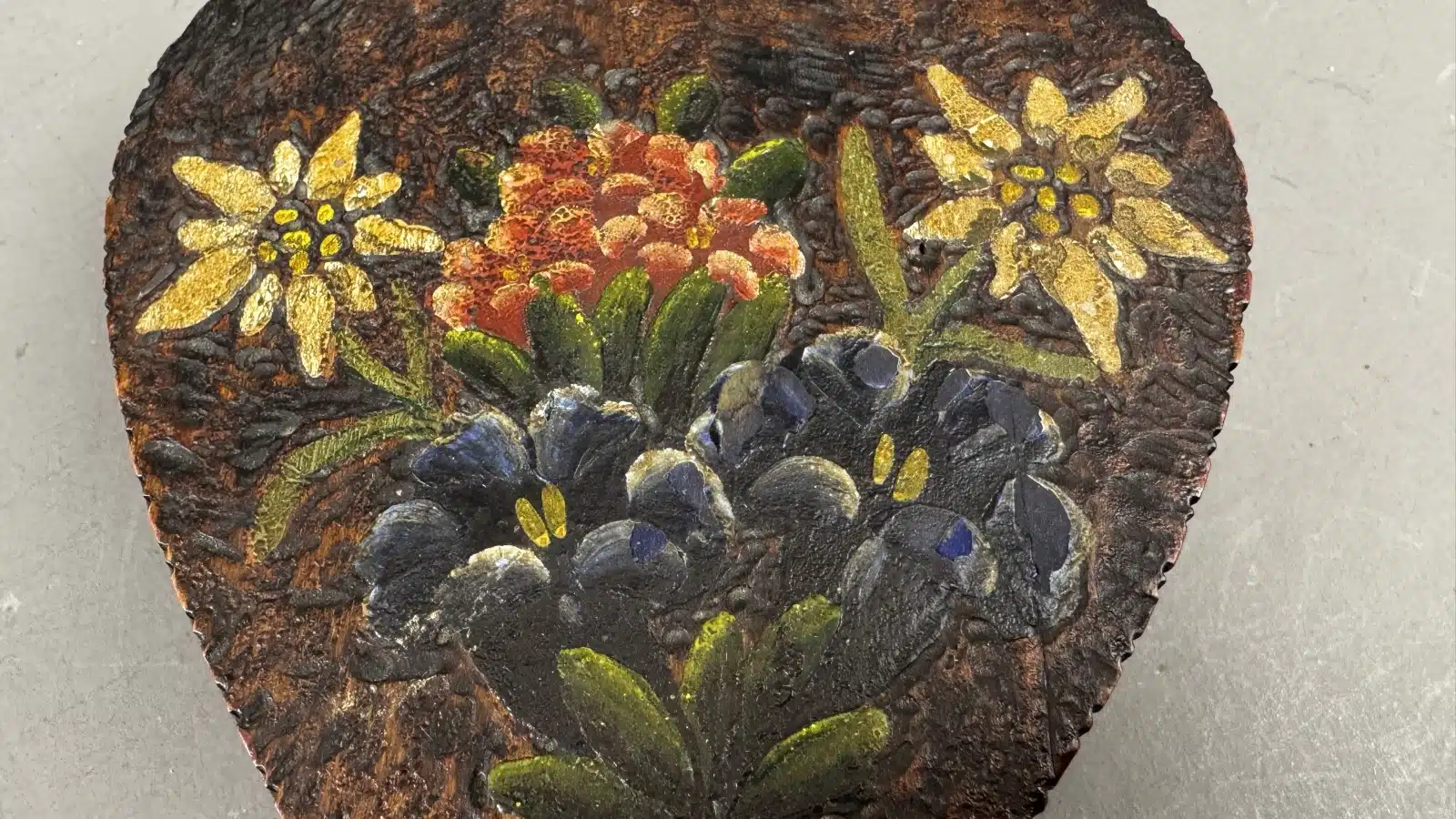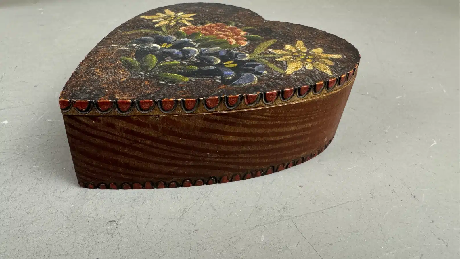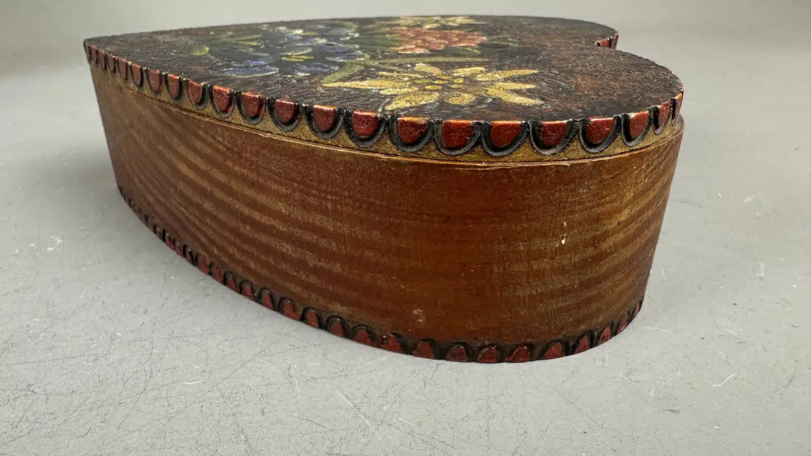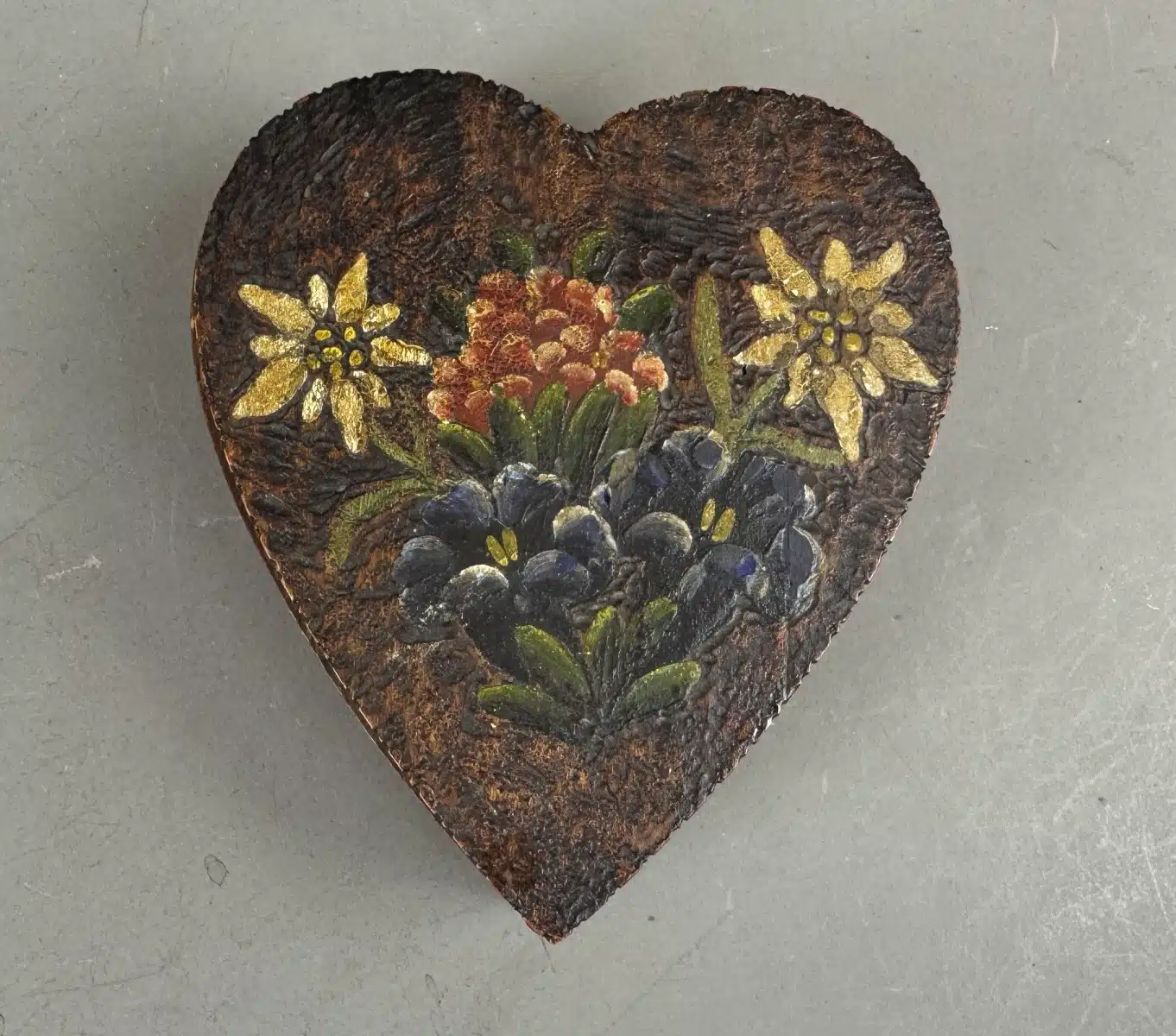 Switbert Lobisser – Aus persönlichem Besitz – herzförmige Holzschatulle, Handbemalt mit Blumenmotiven, L 15 cm H 4,5 cm