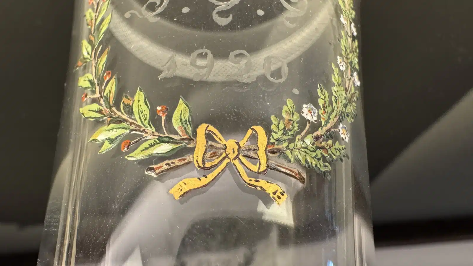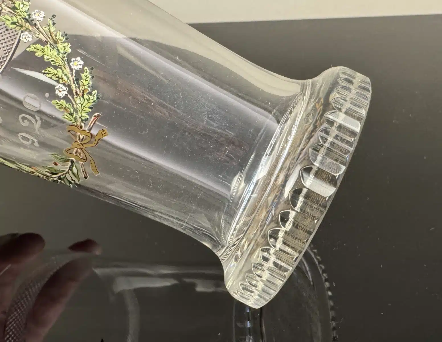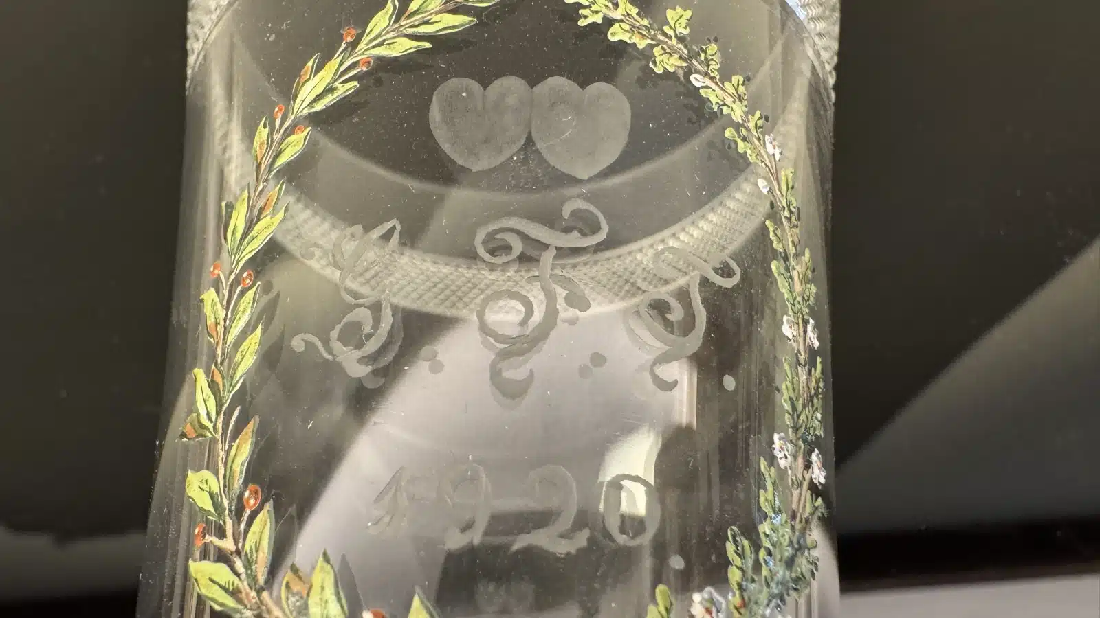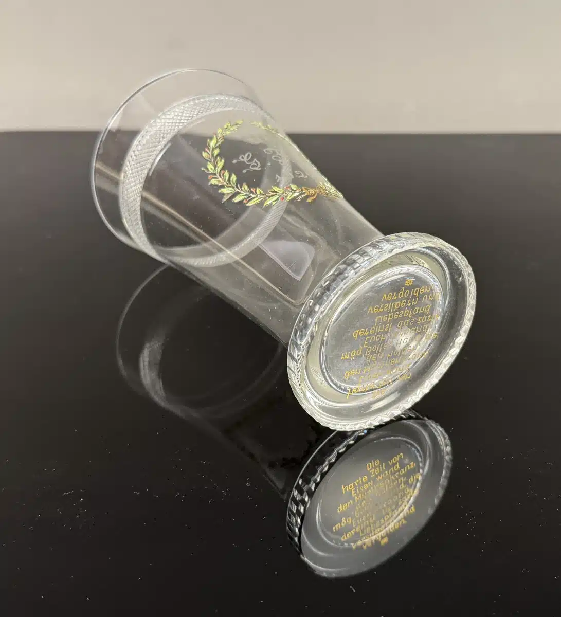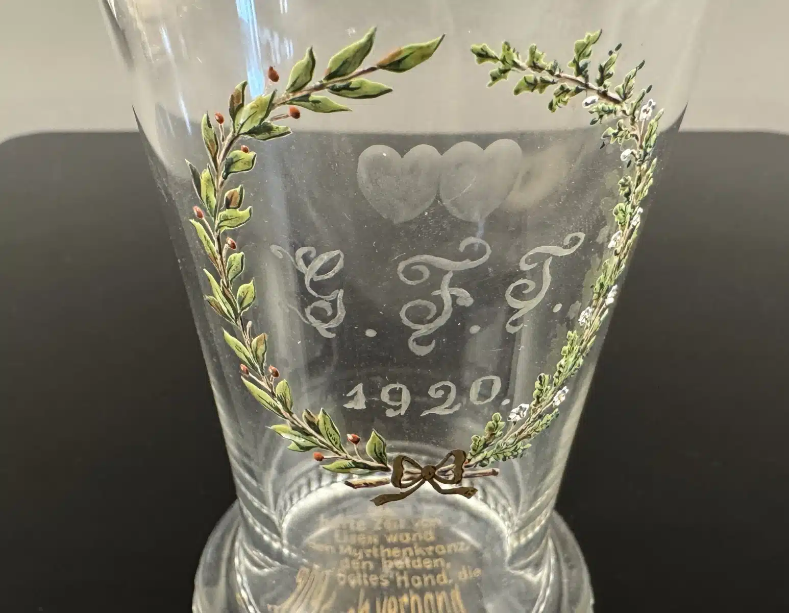 Switbert Lobisser – Aus persönlichem Besitz – Lobmeyr -Hochzeitsglas, 2Herzen, Monogramm, 1920, umrahmt von Lorbeer- und Eichblattzweig gebunden mit Masche, Stand mit ausführlicher goldener Widmung, Die harte Zeit von Eisen wand den Myrthenkranz, den holden, mög Gottes Hand, die Euch verband, dereinst das zarte Liebespfand versilbern und vergolden‘ geschlägelter Ranft, glatter Stand, Höhe 15 cm,