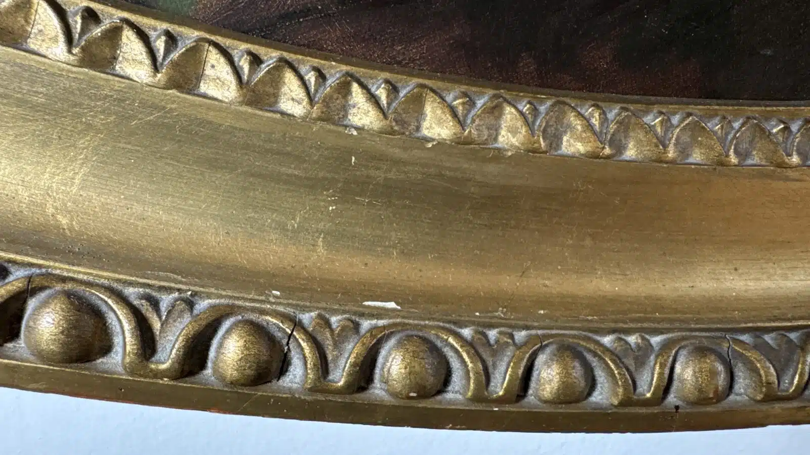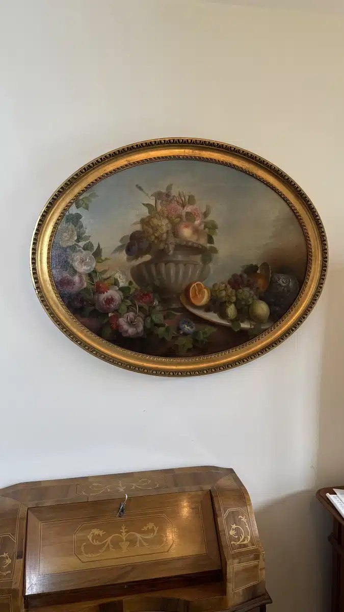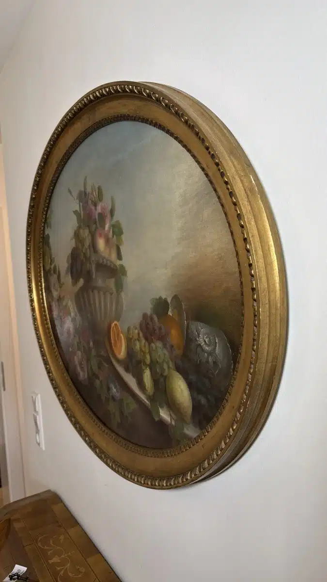 Unbekannter Künstler – Stilleben mit Rosen und Früchten, Öl auf Leinwand, oval, ca. 80 x 103 cm, Ochsenaugenrahmen