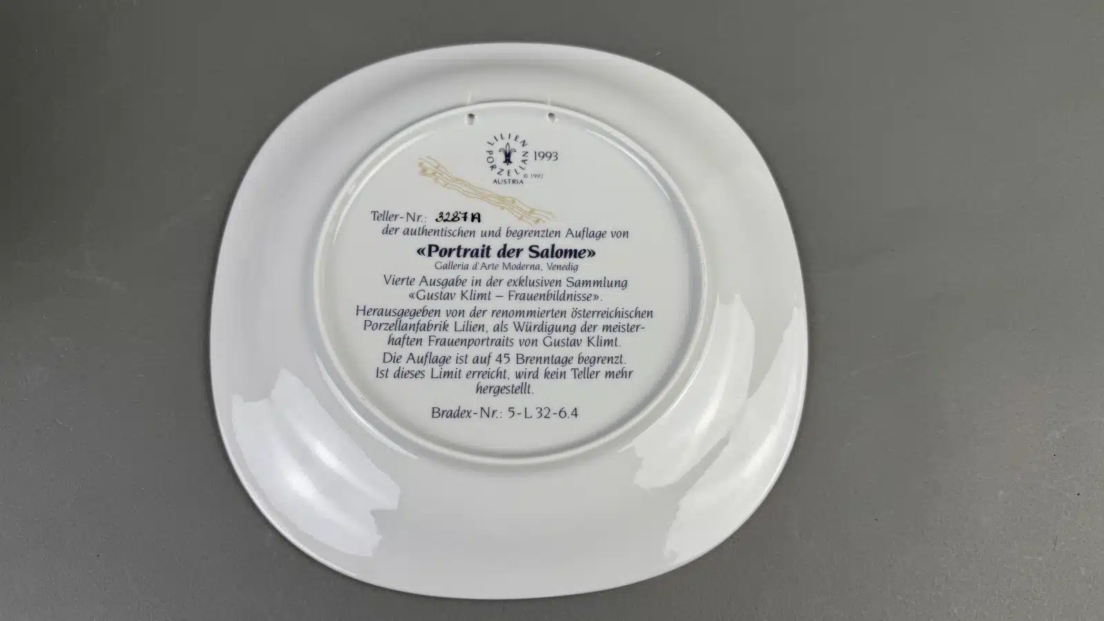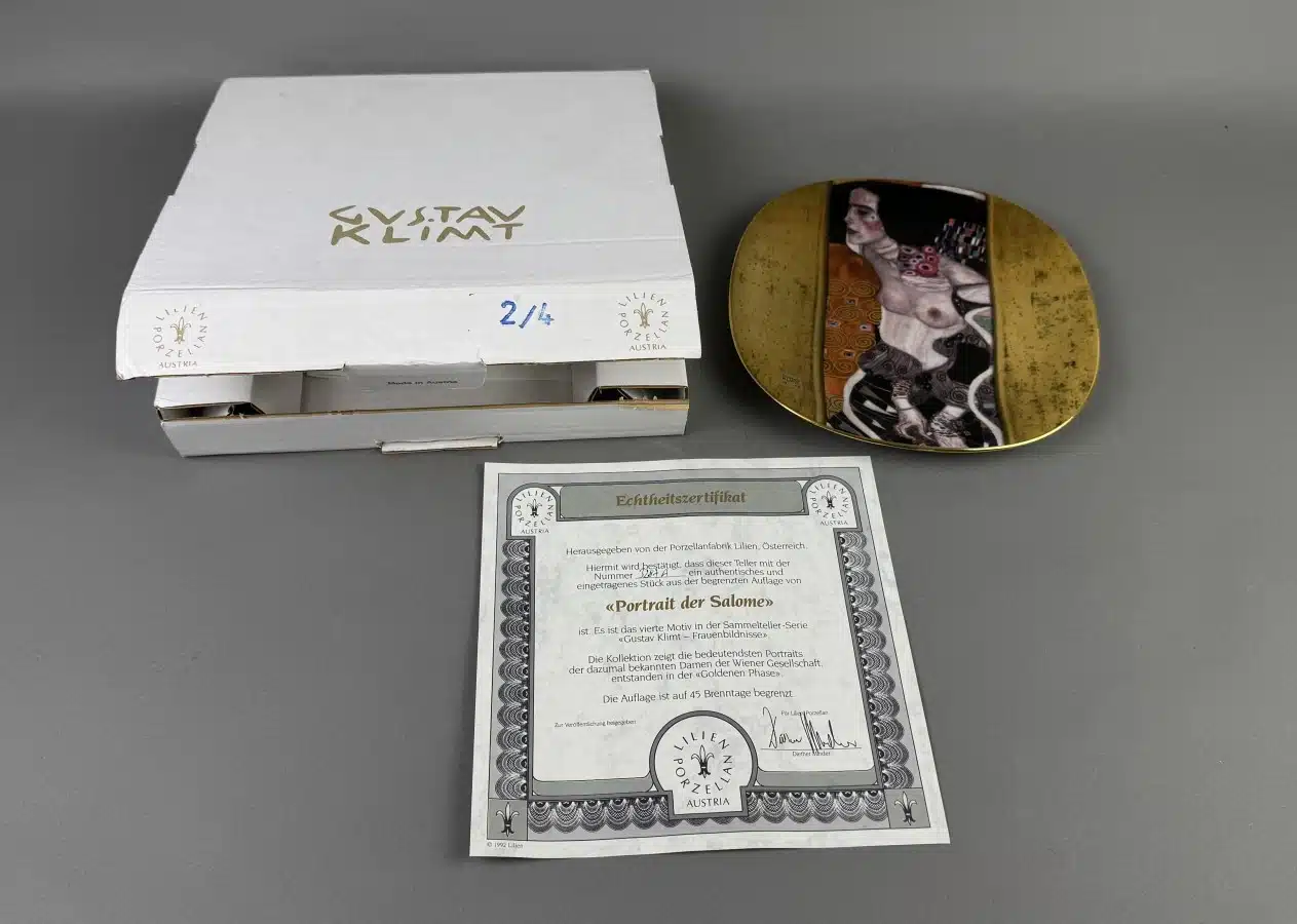 Wandteller, nach Gustav Klimt „Frauenbildnisse“, Lilienporzellan Austria, weiß glasiert, Farbdrucke goldgerändert, 21 x 21 cm, limitierte Auflage, nummeriert und beschriftet, mit Zertifikat, guter Erhaltungszustand OVP