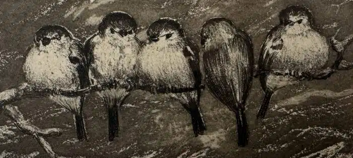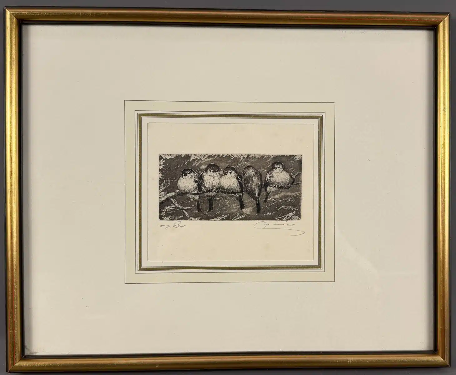 Wilhelm Loisel (geb. 1914 Radsberg/Kärnten, Ausbildung an der Wiener Akademie unter Larwin und Fahringer) Farbradierung, Vögel, signiert, 13×11 cm verglast, gerahmt gesamt 32×26 cm
