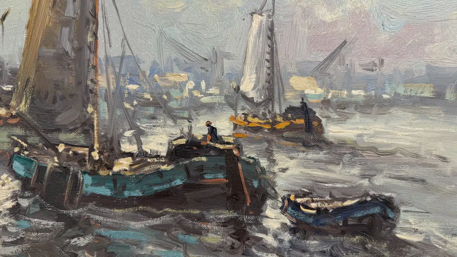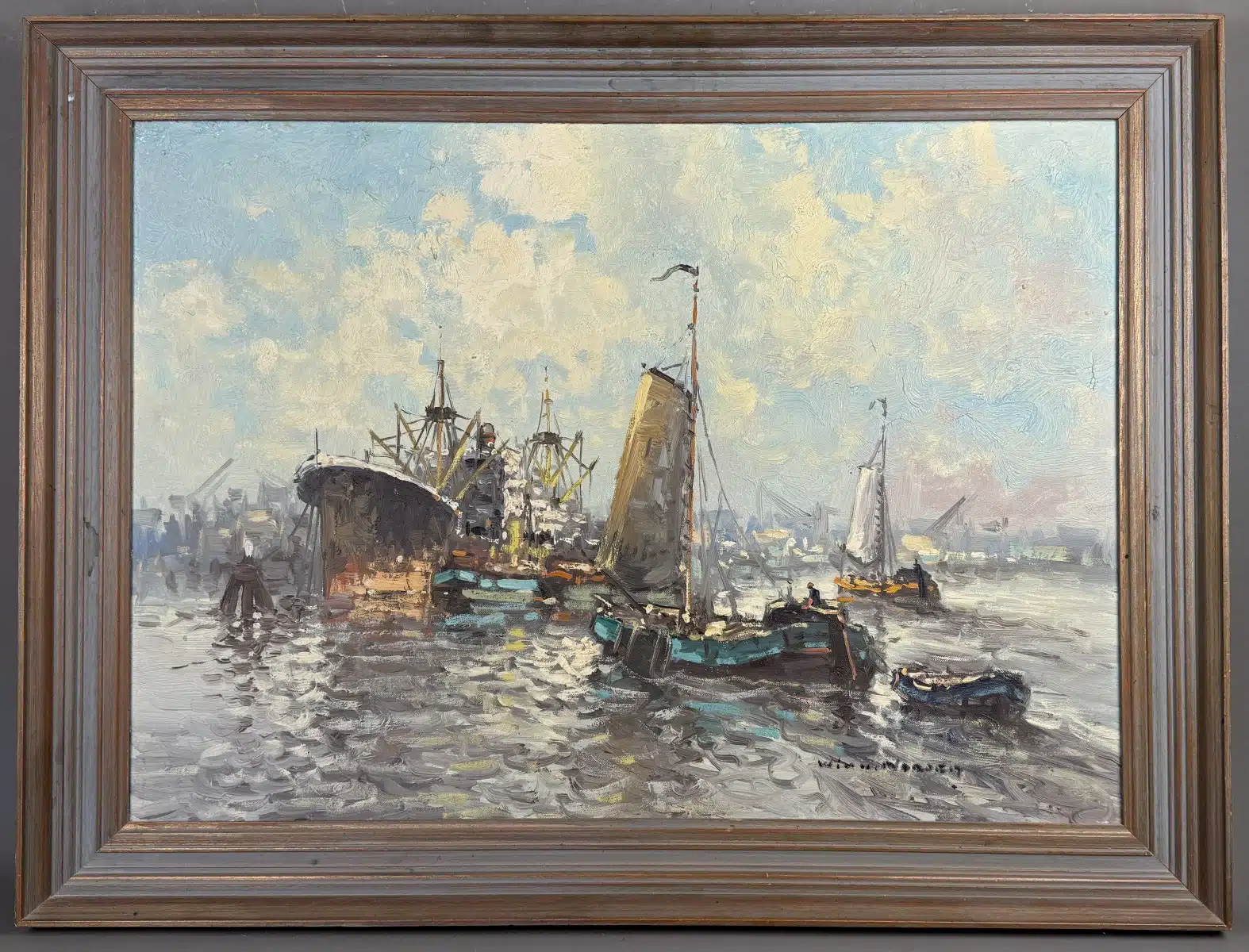 Wim van Norden (1917-2015) Hafen von Amsterdam, Öl auf Leinwand, signiert, ca. 69×49 cm, mit Rahmen ca. 82×62 cm. Wim van Norden war ein bekannter niederländischer Maler und Journalist.