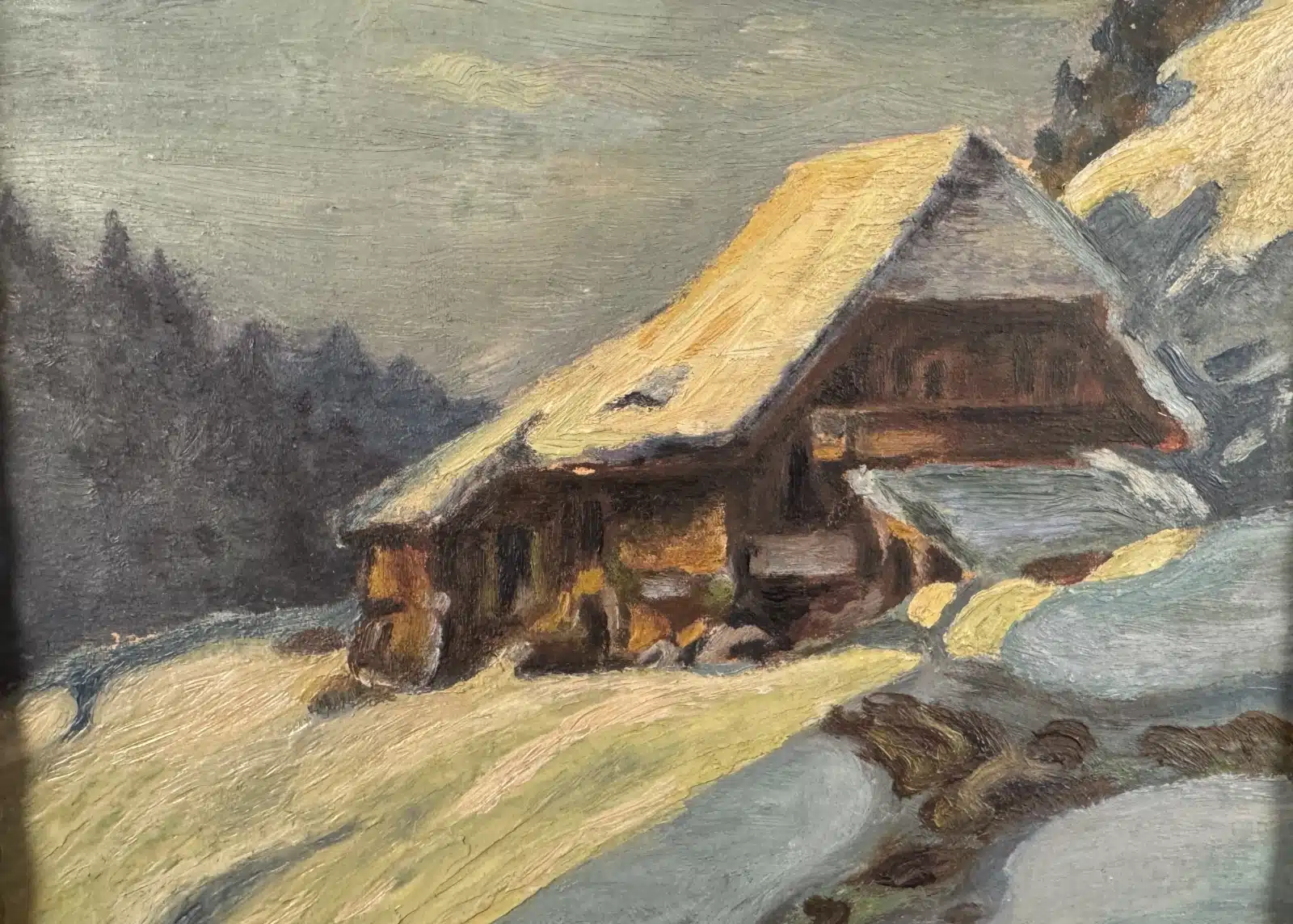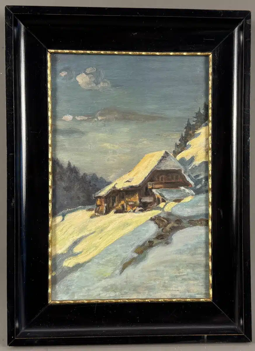 Winterlandschaft, Öl auf Karton, 26×17 cm gerahmt, gesamt 34×25 cm